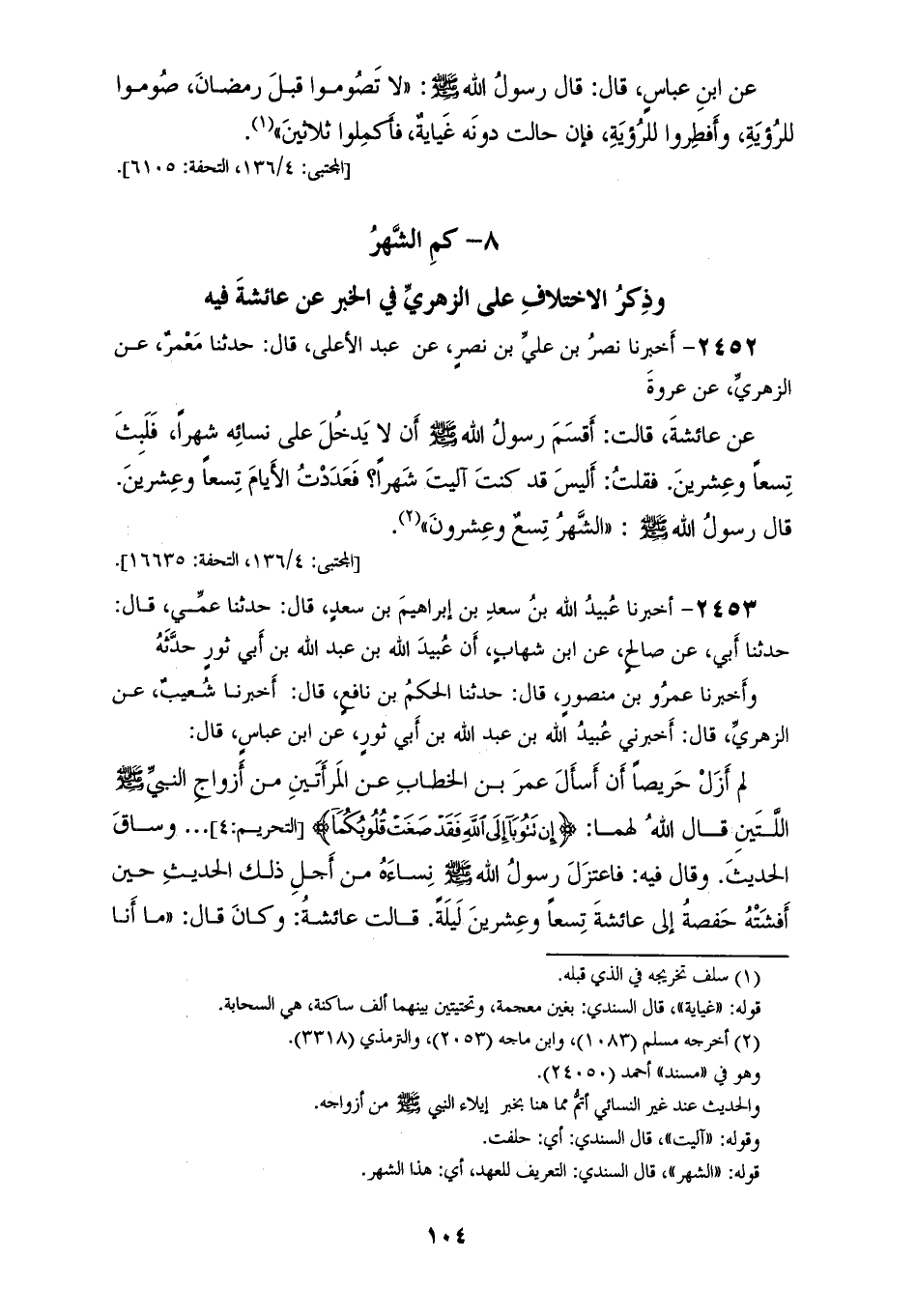 2453 - أَخْبَرَنَا عُبَيْدُ اللهِ بْنُ سَعْدِ بْنِ إِبْرَاهِيمَ بْنِ سَعْدٍ، قَالَ: حَدَّثَنَا عَمِّي، قَالَ: حَدَّثَنَا أَبِي، عَنْ صَالِحٍ، عَنِ ابْنِ شِهَابٍ، أَنَّ عُبَيْدَ اللهِ بْنَ عَبْدِ اللهِ بْنِ أَبِي ثَوْرٍ، حَدَّثَهُ، وأَخْبَرَنَا عَمْرُو بْنُ مَنْصُورٍ، قَالَ: حَدَّثَنَا الْحَكَمُ بْنُ نَافِعٍ، قَالَ: أَخْبَرَنَا شُعَيْبٌ، عَنِ الزُّهْرِيِّ، قَالَ: أَخْبَرَنِي عُبَيْدُ اللهِ بْنُ عَبْدِ اللهِ بْنِ أَبِي ثَوْرٍ، عَنِ ابْنِ عَبَّاسٍ، قَالَ: لَمْ أَزَلْ حَرِيصًا أَنْ أَسْأَلَ عُمَرَ بْنَ الْخَطَّابِ عَنِ الْمَرْأَتَيْنِ مِنْ أَزْوَاجِ النَّبِيِّ صَلَّى اللهُ عَلَيْهِ وَسَلَّمَ اللَّتَيْنِ قَالَ اللهُ لَهُمَا {إِنْ تَتُوبَا إِلَى اللهِ فَقَدْ صَغَتْ قُلُوبُكُمَا} [التحريم: 4] وَسَاقَ الْحَدِيثَ، وَقَالَ فِيهِ: " فَاعْتَزَلَ رَسُولُ اللهِ صَلَّى اللهُ عَلَيْهِ وَسَلَّمَ نِسَاءَهُ مِنْ أَجْلِ ذَلِكَ الْحَدِيثِ حِينَ أَفْشَتْهُ حَفْصَةُ إِلَى عَائِشَةَ تِسْعًا وَعِشْرِينَ لَيْلَةً، قَالَتْ عَائِشَةُ: وَكَانَ قَالَ: «مَا أَنَا بِدَاخِلٍ عَلَيْهِنَّ شَهْرًا» مِنْ شِدَّةِ مَوْجِدَتِهِ عَلَيْهِنَّ حِينَ حَدَّثَهُ اللهُ حَدِيثَهُنَّ، فَلَمَّا مَضَتْ تِسْعٌ وَعِشْرُونَ لَيْلَةً دَخَلَ عَلَى عَائِشَةَ، فَبَدَأَ بِهَا فَقَالَتْ لَهُ عَائِشَةُ: إِنَّكَ قَدْ كُنْتَ آلَيْتَ يَا رَسُولَ اللهِ أَلَّا تَدْخُلَ عَلَيْهِنَّ شَهْرًا، وَإِنَّا أَصْبَحْنَا مِنْ تِسْعٍ وَعِشْرِينَ لَيْلَةً نَعُدُّهَا عَدَدًا، فَقَالَ رَسُولُ اللهِ صَلَّى اللهُ عَلَيْهِ وَسَلَّمَ: «§الشَّهْرُ تِسْعٌ وَعِشْرُونَ لَيْلَةً»