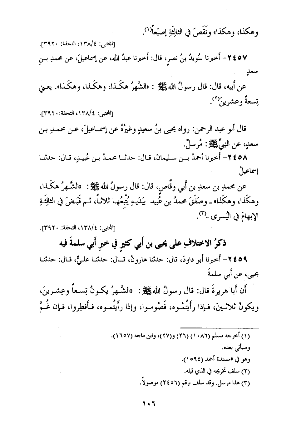 2457 - أَخْبَرَنَا سُوَيْدُ بْنُ نَصْرٍ، قَالَ: أَخْبَرَنَا عَبْدُ اللهِ، عَنْ إِسْمَاعِيلَ، عَنْ مُحَمَّدِ بْنِ سَعْدٍ، عَنْ أَبِيهِ قَالَ: قَالَ رَسُولُ اللهِ صَلَّى اللهُ عَلَيْهِ وَسَلَّمَ: «§الشَّهْرُ هَكَذَا وَهَكَذَا وَهَكَذَا» يَعْنِي تِسْعَةً وَعِشْرِينَ. قَالَ أَبُو عَبْدِ الرَّحْمَنِ: رَوَاهُ يَحْيَى بْنُ سَعِيدٍ، وَغَيْرُهُ عَنْ إِسْمَاعِيلَ، عَنْ مُحَمَّدِ بْنِ سَعْدٍ، عَنِ النَّبِيِّ صَلَّى اللهُ عَلَيْهِ وَسَلَّمَ مُرْسَلٌ
