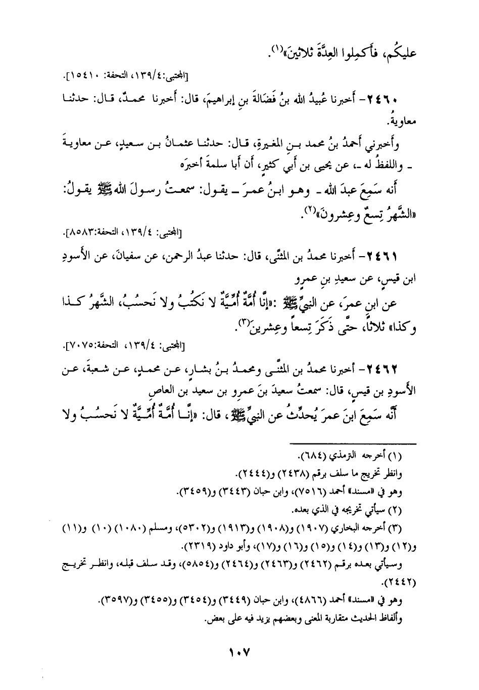 2460 - أَخْبَرَنَا عُبَيْدُ اللهِ بْنُ فَضَالَةَ بْنِ إِبْرَاهِيمَ، قَالَ: أَخْبَرَنَا مُحَمَّدٌ، قَالَ: حَدَّثَنَا مُعَاوِيَةُ، وَأَخْبَرَنِي أَحْمَدُ بْنُ مُحَمَّدِ بْنِ الْمُغِيرَةِ، قَالَ: حَدَّثَنَا عُثْمَانُ بْنُ سَعِيدٍ، عَنْ مُعَاوِيَةَ، وَاللَّفْظُ لَهُ عَنْ يَحْيَى بْنِ أَبِي كَثِيرٍ، أَنَّ أَبَا سَلَمَةَ، أَخْبَرَهُ أَنَّهُ، سَمِعَ عَبْدَ اللهِ وَهُوَ ابْنُ عُمَرَ يَقُولُ: سَمِعْتُ رَسُولَ اللهِ صَلَّى اللهُ عَلَيْهِ وَسَلَّمَ يَقُولُ: «§الشَّهْرُ تِسْعٌ وَعِشْرُونَ»