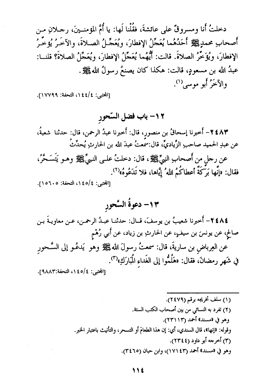 2483 - أَخْبَرَنَا إِسْحَاقُ بْنُ مَنْصُورٍ، قَالَ: أَخْبَرَنَا عَبْدُ الرَّحْمَنِ، قَالَ: حَدَّثَنَا شُعْبَةُ، عَنْ عَبْدِ الْحَمِيدِ، صَاحِبِ الزِّيَادِيِّ، قَالَ: سَمِعْتُ عَبْدَ اللهِ بْنَ الْحَارِثِ، يُحَدِّثُ عَنْ رَجُلٍ مِنْ أَصْحَابِ النَّبِيِّ صَلَّى اللهُ عَلَيْهِ وَسَلَّمَ قَالَ: دَخَلْتُ عَلَى النَّبِيِّ صَلَّى اللهُ عَلَيْهِ وَسَلَّمَ وَهُوَ يَتَسَحَّرُ فَقَالَ: «§إِنَّهَا بَرَكَةٌ أَعْطَاكُمُ اللهُ إِيَّاهَا، فَلَا تَدَعُوهُ»