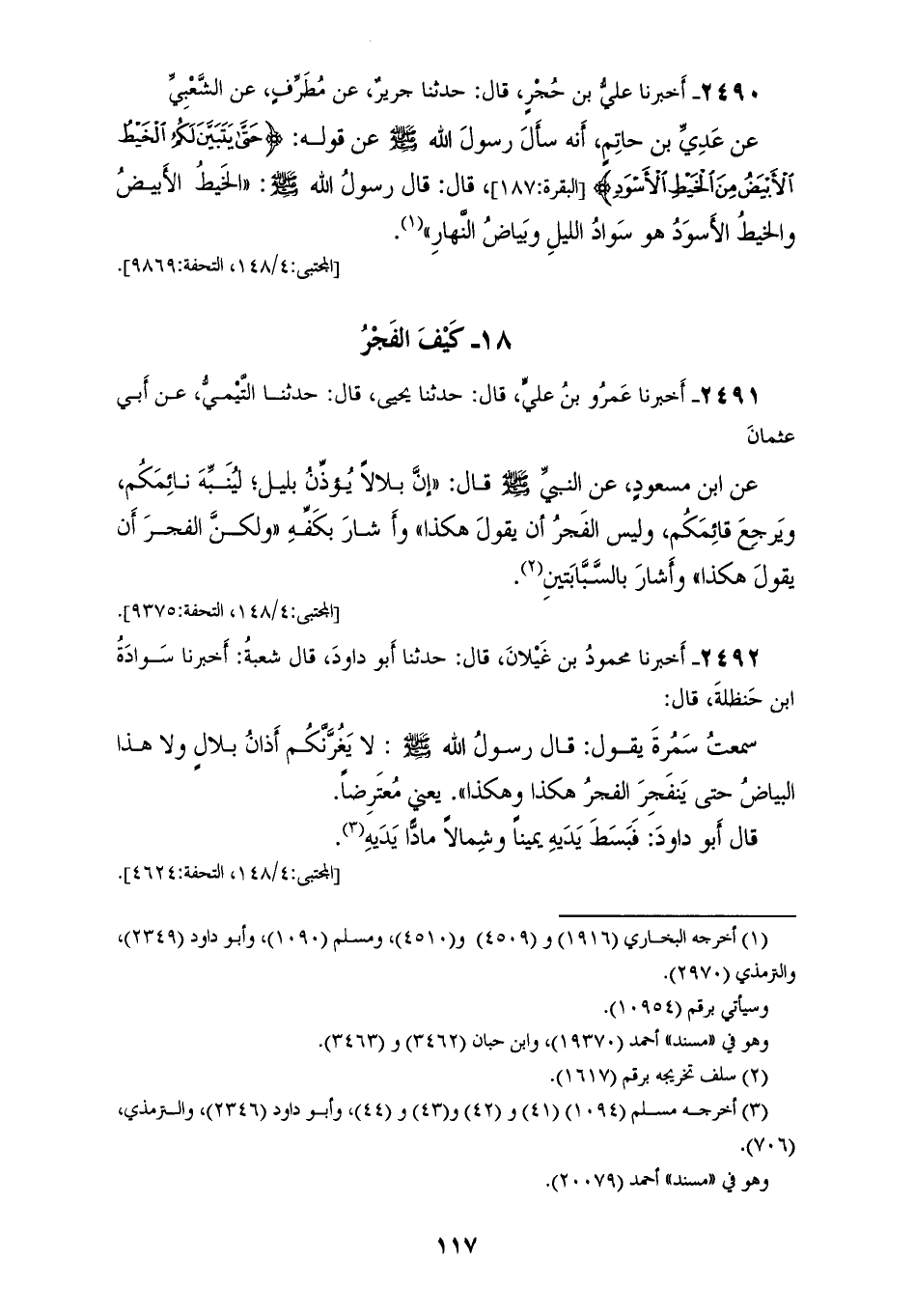 2490 - أَخْبَرَنَا عَلِيُّ بْنُ حُجْرٍ قَالَ: حَدَّثَنَا جَرِيرٌ عَنْ مُطَرِّفٍ عَنِ الشَّعْبِيِّ عَنْ عَدِيِّ بْنِ حَاتِمٍ أَنَّهُ سَأَلَ رَسُولَ اللهِ صَلَّى اللهُ عَلَيْهِ وَسَلَّمَ عَنْ قَوْلِهِ {حَتَّى يَتَبَيَّنَ لَكُمُ الْخَيْطُ الْأَبْيَضُ مِنَ الْخَيْطِ الْأَسْوَدِ} [البقرة: 187] قَالَ: قَالَ رَسُولُ اللهِ صَلَّى اللهُ عَلَيْهِ وَسَلَّمَ: «§الْخَيْطُ الْأَبْيَضُ والْخَيْطُ الْأَسْوَدُ هُو سَوَادُ اللَّيْلِ وَبَيَاضُ النَّهَارِ»