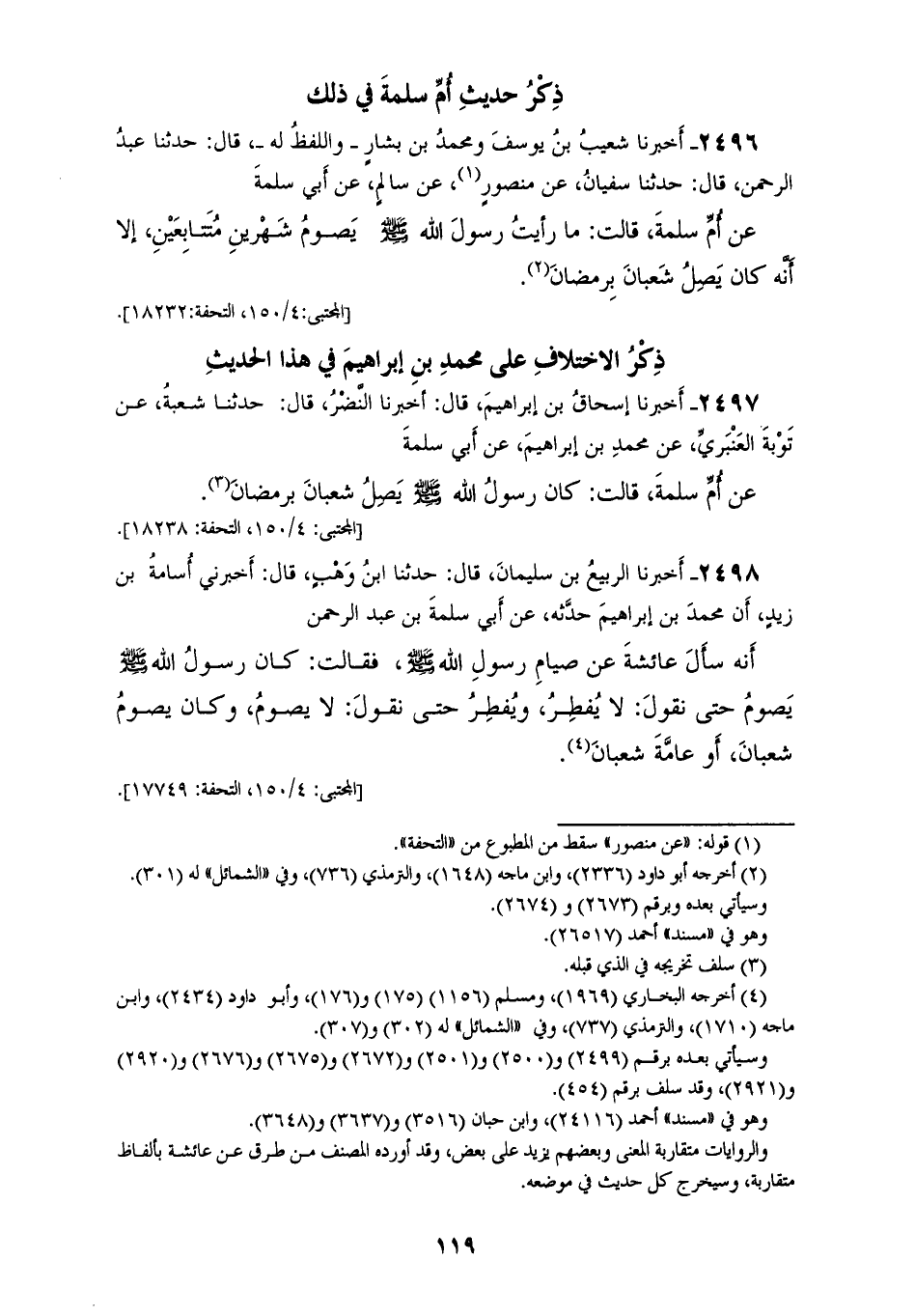 2497 - أَخْبَرَنَا إِسْحَاقُ بْنُ إِبْرَاهِيمَ قَالَ أَخْبَرَنَا النَّضْرُ قَالَ: حَدَّثَنَا شُعْبَةُ عَنْ تَوْبِةَ الْعَنْبَرِيِّ عَنْ مُحَمَّدِ بْنِ إِبْرَاهِيمَ عَنْ أَبِي سَلَمَةَ عَنْ أُمِّ سَلَمَةَ قَالَتْ: «§كَانَ رَسُولُ اللهِ صَلَّى اللهُ عَلَيْهِ وَسَلَّمَ يَصِلُ شَعْبَانَ بِرَمَضَانَ»