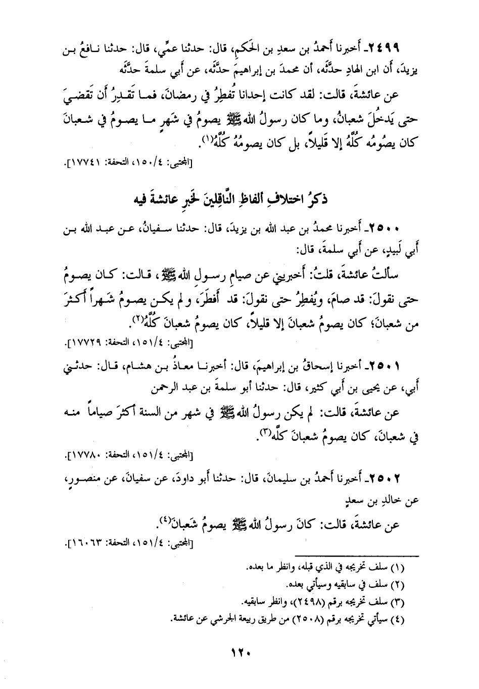 2499 - أَخْبَرَنَا أَحْمَدُ بْنُ سَعْدِ بْنِ الْحَكَمِ قَالَ: حَدَّثَنَا عَمِّي قَالَ: حَدَّثَنَا نَافِعُ بْنُ يَزِيدَ أَنَّ ابْنَ الْهَادِ حَدَّثَهُ أَنَّ مُحَمَّدَ بْنَ إِبْرَاهِيمَ حَدَّثَهُ عَنْ أَبِي سَلَمَةَ حَدَّثَهُ عَنْ عَائِشَةَ قَالَتْ: لَقَدْ كَانَتْ إِحْدَانَا تُفْطِرُ فِي رَمَضَانَ فَمَا تَقْدِرُ أَنْ تَقْضِيَ حَتَّى يَدْخُلَ شَعْبَانُ، وَمَا كَانَ رَسُولُ اللهِ صَلَّى اللهُ عَلَيْهِ وَسَلَّمَ «§يَصُومُ فِي شَهْرٍ مَا يَصُومُ فِي شَعْبَانَ، كَانَ يَصُومُهُ كُلَّهُ إِلَّا قَلِيلًا، بَلْ كَانَ يَصُومُهُ كُلَّهُ»
