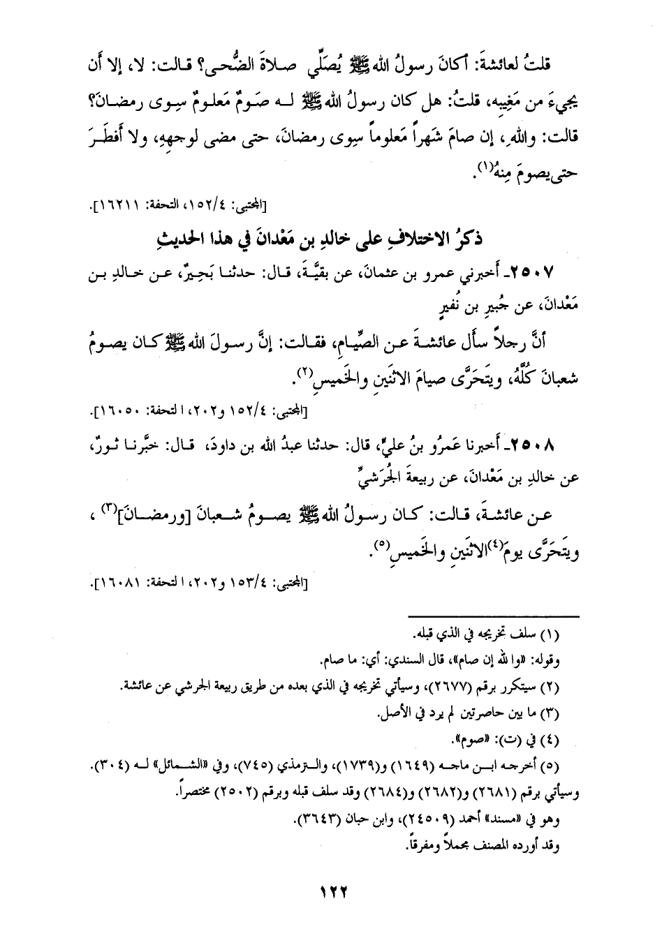 2508 - أَخْبَرَنَا عَمْرُو بْنُ عَلِيٍّ قَالَ: حَدَّثَنَا عَبْدُ اللهِ بْنُ دَاوُدَ قَالَ أَخْبَرَنَا ثَوْرٌ عَنْ خَالِدِ بْنِ مَعْدَانَ عَنْ رَبِيعَةَ الْجُرَشِيِّ عَنْ عَائِشَةَ قَالَتْ كَانَ رَسُولُ اللهِ صَلَّى اللهُ عَلَيْهِ وَسَلَّمَ «§يَصُومُ شَعْبَانَ وَرَمَضَانَ وَيَتَحَرَّى صَوْمَ الِاثْنَيْنِ وَالْخَمِيسِ»