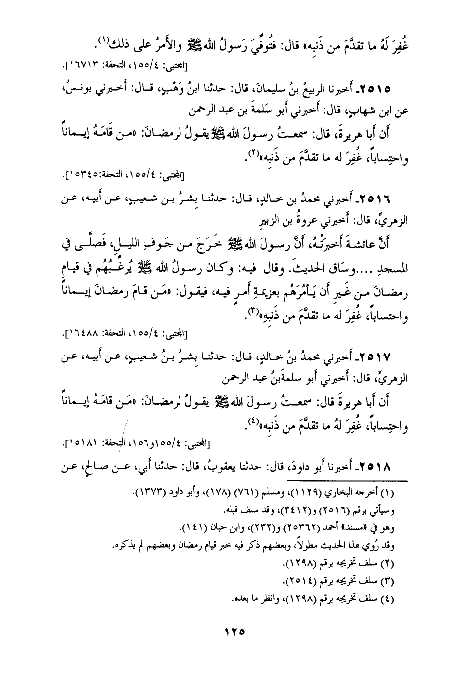 2516 - أَخْبَرَنِي مُحَمَّدُ بْنُ خَالِدٍ قَالَ: حَدَّثَنَا بِشْرُ بْنُ شُعَيْبٍ عَنْ أَبِيهِ عَنِ الزُّهْرِيِّ قَالَ: أَخْبَرَنِي عُرْوَةُ بْنُ الزُّبَيْرِ أَنَّ عَائِشَةَ أَخْبَرَتْهُ أَنَّ رَسُولَ اللهِ صَلَّى اللهُ عَلَيْهِ وَسَلَّمَ خَرَجَ مِنْ جَوْفِ اللَّيْلِ فَصَلَّى فِي الْمَسْجِدِ، وَسَاقَ الْحَدِيثَ، وَقَالَ فِيهِ: وَكَانَ رَسُولُ اللهِ صَلَّى اللهُ عَلَيْهِ وَسَلَّمَ يُرَغِّبُهُمْ فِي قِيَامِ رَمَضَانَ مِنْ غَيْرِ أَنْ يَأْمُرَهُمْ بِعَزِيمَةِ أَمْرٍ فِيهِ، فَيَقُولُ: «§مَنْ قَامَ رَمَضَانَ إِيمَانًا وَاحْتِسَابًا غُفِرَ لَهُ مَا تَقَدَّمَ مِنْ ذَنْبِهِ»