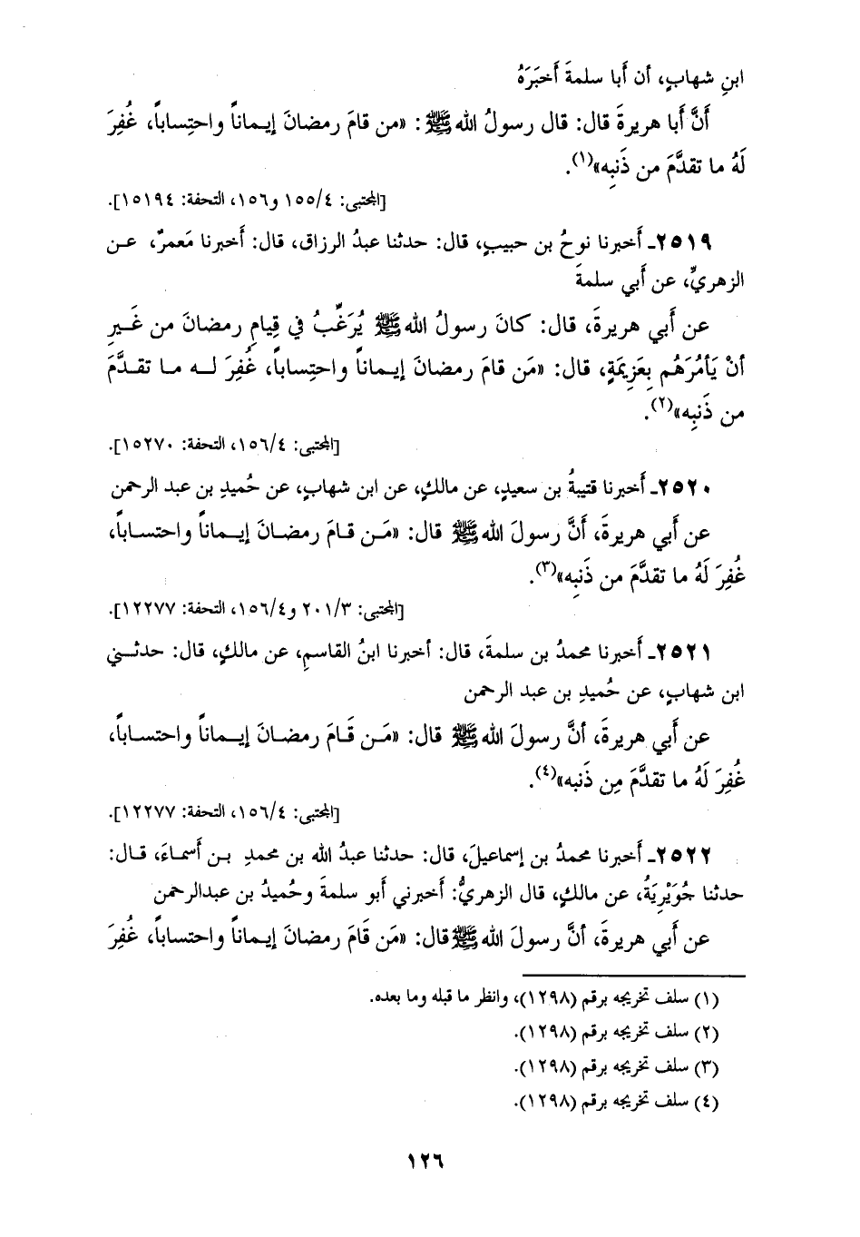 2520 - أَخْبَرَنَا قُتَيْبَةُ بْنُ سَعِيدٍ عَنْ مَالِكٍ عَنِ ابْنِ شِهَابٍ عَنْ حُمَيْدِ بْنِ عَبْدِ الرَّحْمَنِ عَنْ أَبِي هُرَيْرَةَ أَنَّ رَسُولَ اللهِ صَلَّى اللهُ عَلَيْهِ وَسَلَّمَ قَالَ: «§مَنْ قَامَ رَمَضَانَ إِيمَانًا وَاحْتِسَابًا غُفِرَ لَهُ مَا تَقَدَّمَ مِنْ ذَنْبِهِ»