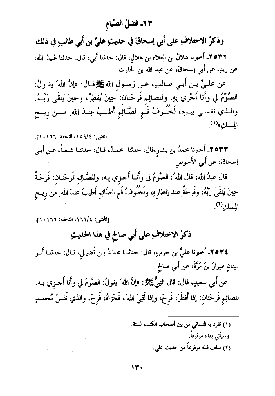 2532 - أَخْبَرَنَا هِلَالُ بْنُ الْعَلَاءِ بْنِ هِلَالٍ قَالَ: حَدَّثَنَا أَبِي قَالَ: حَدَّثَنَا عُبَيْدُ اللهِ، عَنْ زَيْدٍ، عَنْ أَبِي إِسْحَاقَ، عَنْ عَبْدِ اللهِ بْنِ الْحَارِثِ، عَنْ عَلِيِّ بْنِ أَبِي طَالِبٍ، عَنْ رَسُولِ اللهِ صَلَّى اللهُ عَلَيْهِ وَسَلَّمَ قَالَ: " إِنَّ اللهَ يَقُولُ: §الصَّوْمُ لِي وَأَنَا أَجْزِي بِهِ، وَلِلصَّائِمِ فَرْحَتَانِ: حِينَ يُفْطِرُ، وَحِينَ يَلْقَى رَبَّهُ، وَالَّذِي نَفْسِي بِيَدِهِ لَخُلُوفُ فَمِ الصَّائِمِ أَطْيَبُ عِنْدَ اللهِ مِنْ رِيحِ الْمِسْكِ "