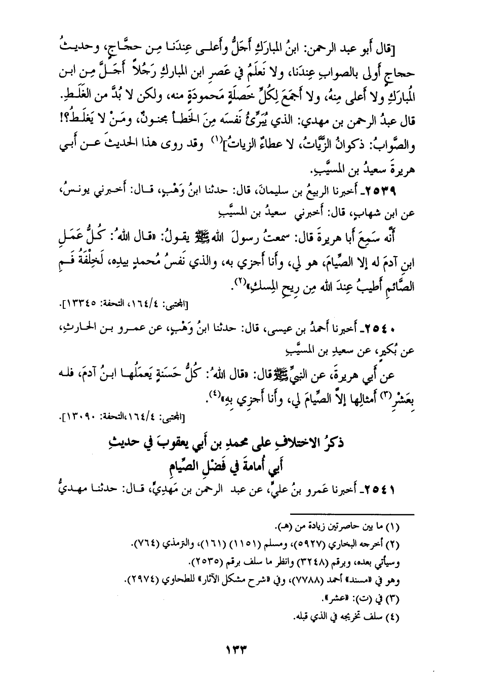 2540 - أَخْبَرَنَا أَحْمَدُ بْنُ عِيسَى، قَالَ: حَدَّثَنَا ابْنُ وَهْبٍ، عَنْ عَمْرِو بْنِ الْحَارِثِ، عَنْ بُكَيْرٍ، عَنْ سَعِيدِ بْنِ الْمُسَيِّبِ، عَنْ أَبِي هُرَيْرَةَ، عَنِ النَّبِيِّ صَلَّى اللهُ عَلَيْهِ وَسَلَّمَ قَالَ: " قَالَ اللهُ: §كُلُّ حَسَنَةٍ يَعْمَلُهَا ابْنُ آدَمَ فَلَهُ بِعَشْرِ أَمْثَالِهَا إِلَّا الصِّيَامَ لِي وَأَنَا أَجْزِي بِهِ "