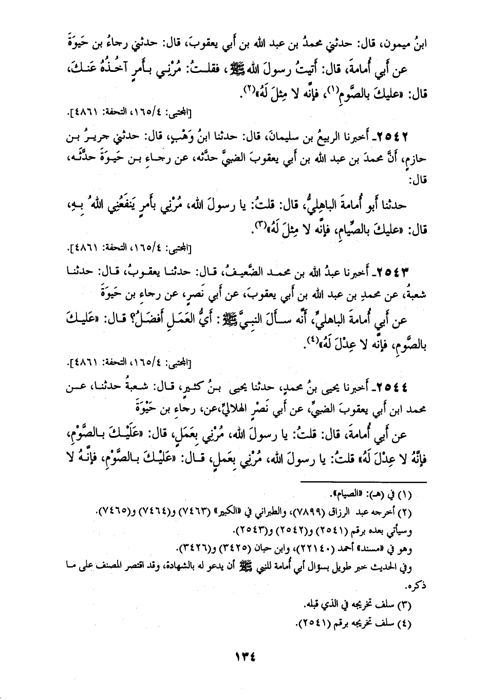 2542 - أَخْبَرَنَا الرَّبِيعُ بْنُ سُلَيْمَانَ، قَالَ: حَدَّثَنَا ابْنُ وَهْبٍ، قَالَ: حَدَّثَنِي جَرِيرُ بْنُ حَازِمٍ، أَنَّ مُحَمَّدَ بْنَ عَبْدِ اللهِ بْنِ أَبِي يَعْقُوبَ الضَّبِّيَّ حَدَّثَهُ، عَنْ رَجَاءِ بْنِ حَيْوَةَ، حَدَّثَهُ قَالَ: حَدَّثَنَا أَبُو أُمَامَةَ الْبَاهِلِيُّ، قَالَ: قُلْتُ: يَا رَسُولَ اللهِ، مُرْنِي بِأَمْرٍ يَنْفَعُنِي اللهُ بِهِ، قَالَ: «§عَلَيْكَ بِالصِّيَامِ فَإِنَّهُ لَا مِثْلَ لَهُ»