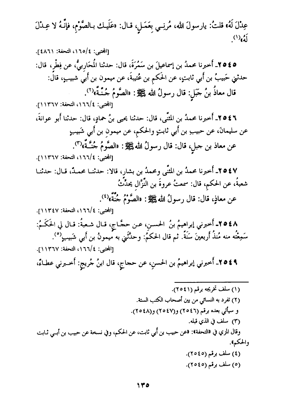 2546 - أَخْبَرَنَا مُحَمَّدُ بْنُ الْمُثَنَّى، قَالَ: حَدَّثَنَا يَحْيَى بْنُ حَمَّادٍ، قَالَ: حَدَّثَنَا أَبُو عَوَانَةَ، عَنْ سُلَيْمَانَ، عَنْ حَبِيبِ بْنِ أَبِي ثَابِتٍ، وَالْحَكَمِ، عَنْ مَيْمُونِ بْنِ أَبِي شَبِيبٍ، عَنْ مُعَاذِ بْنِ جَبَلٍ، قَالَ: قَالَ رَسُولُ اللهِ صَلَّى اللهُ عَلَيْهِ وَسَلَّمَ: «§الصَّوْمُ جُنَّةٌ»