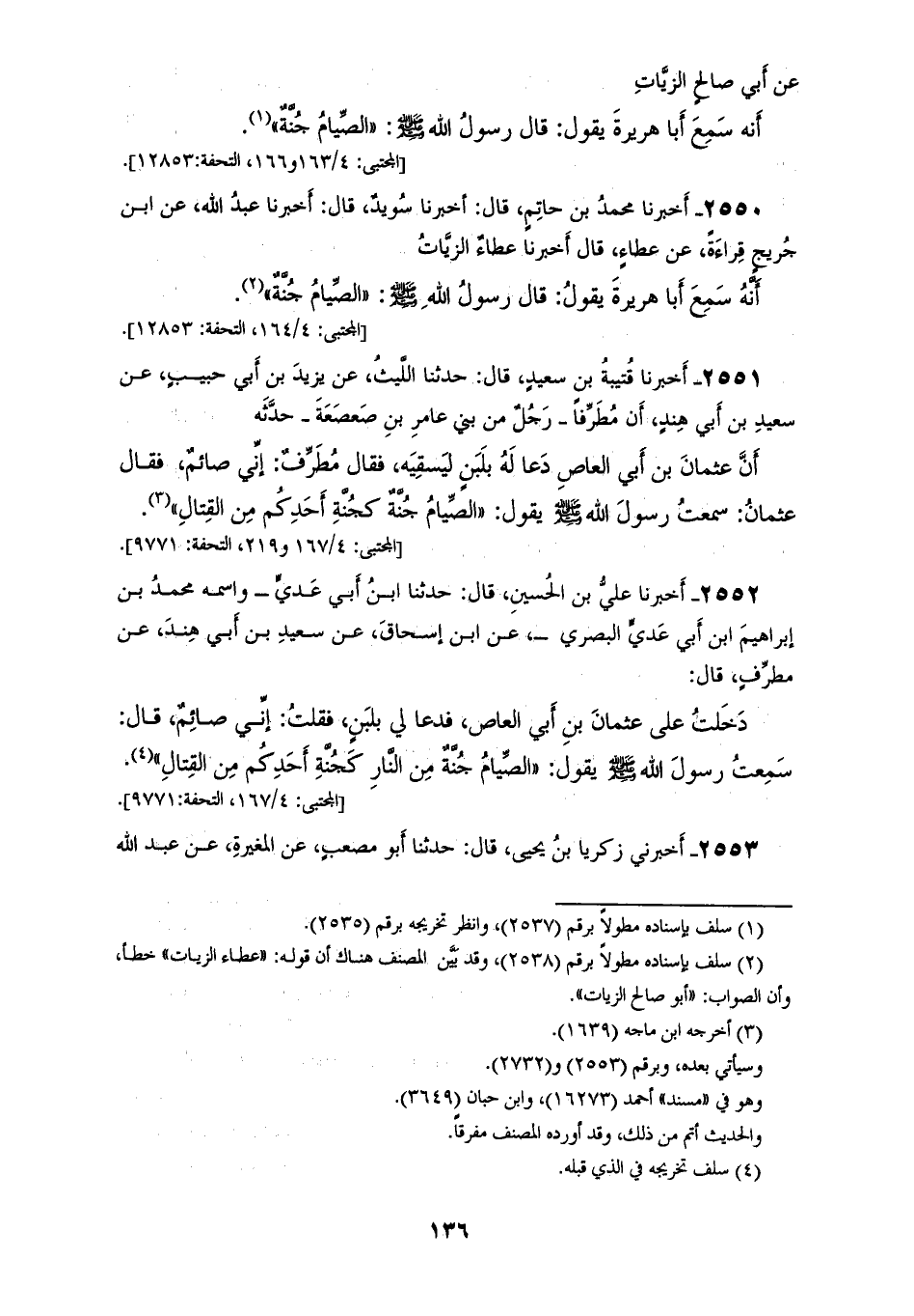2551 - أَخْبَرَنَا قُتَيْبَةُ بْنُ سَعِيدٍ، قَالَ: حَدَّثَنَا اللَّيْثُ، عَنْ يَزِيدَ بْنِ أَبِي حَبِيبٍ، عَنْ سَعِيدِ بْنِ أَبِي هِنْدٍ، أَنَّ مُطَرِّفًا، رَجُلٌ مِنْ بَنِي عَامِرِ بْنِ صَعْصَعَةَ حَدَّثَهُ، أَنَّ عُثْمَانَ بْنَ أَبِي الْعَاصِ دَعَا لَهُ بِلَبَنٍ لِيَسْقِيَهُ، فَقَالَ مُطَرِّفٌ: إِنِّي صَائِمٌ، فَقَالَ عُثْمَانُ: سَمِعْتُ رَسُولَ اللهِ صَلَّى اللهُ عَلَيْهِ وَسَلَّمَ يَقُولُ: «§الصِّيَامُ جُنَّةٌ كَجُنَّةِ أَحَدِكُمْ مِنَ الْقِتَالِ»
