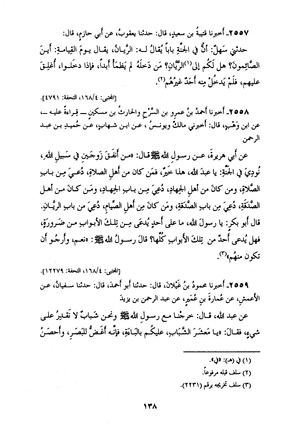 2558 - أَخْبَرَنَا أَحْمَدُ بْنُ عَمْرِو بْنِ السَّرْحِ، وَالْحَارِثُ بْنُ مِسْكِينٍ، قِرَاءَةً عَلَيْهِ عَنْ ابن وَهْبٍ قَالَ: أَخْبَرَنِي مَالِكٌ، وَيُونُسُ، عَنِ ابْنِ شِهَابٍ، عَنْ حُمَيْدِ بْنِ عَبْدِ الرَّحْمَنِ، عَنْ أَبِي هُرَيْرَةَ، عَنْ رَسُولِ اللهِ صَلَّى اللهُ عَلَيْهِ وَسَلَّمَ قَالَ: " §مَنْ أَنْفَقَ زَوْجَيْنِ فِي سَبِيلِ اللهِ نُودِيَ فِي الْجَنَّةِ: يَا عَبْدَ اللهِ هَذَا خَيْرٌ، فَمَنْ كَانَ مِنْ أَهْلِ الصَّلَاةِ دُعِيَ مِنْ بَابِ الصَّلَاةِ، وَمَنْ كَانَ مِنْ أَهْلِ الْجِهَادِ دُعِيَ مِنْ بَابِ الْجِهَادِ، وَمَنْ كَانَ مِنْ أَهْلِ الصَّدَقَةِ دُعِيَ مِنْ بَابِ الصَّدَقَةِ، وَمَنْ كَانَ مِنْ أَهْلِ الصِّيَامِ دُعِيَ مِنْ بَابِ الرَّيَّانِ " قَالَ أَبُو بَكْرٍ: يَا رَسُولَ اللهِ، مَا عَلَى أَحَدٍ يُدْعَى مِنْ تِلْكِ الْأَبْوَابِ مِنْ ضَرُورَةٍ؟ فَهَلْ يُدْعَى أَحَدٌ مِنْ تِلْكَ الْأَبْوَابِ كُلِّهَا؟ قَالَ رَسُولُ اللهِ صَلَّى اللهُ عَلَيْهِ وَسَلَّمَ: «نَعَمْ، وَأَرْجُو أَنْ تَكُونَ مِنْهُمْ»