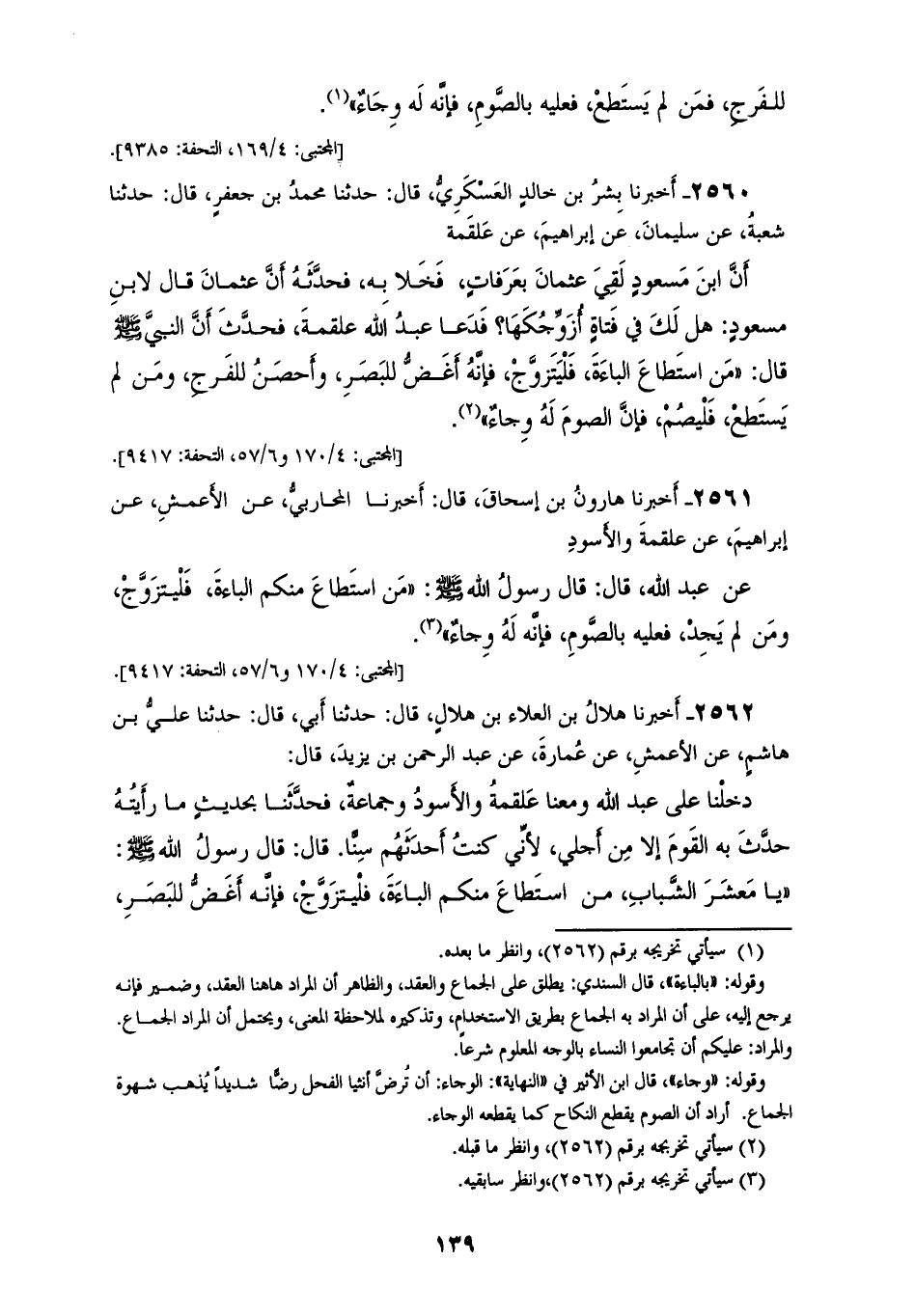 2560 - أَخْبَرَنَا بِشْرُ بْنُ خَالِدٍ الْعَسْكَرِيُّ، قَالَ: حَدَّثَنَا مُحَمَّدُ بْنُ جَعْفَرٍ، قَالَ: حَدَّثَنَا شُعْبَةُ، عَنْ سُلَيْمَانَ، عَنْ إِبْرَاهِيمَ، عَنْ عَلْقَمَةَ، أَنَّ ابْنَ مَسْعُودٍ، لَقِيَ عُثْمَانَ بِعَرَفَاتٍ فَخَلَا بِهِ فَحَدَّثَهُ أَنَّ عُثْمَانَ قَالَ لِابْنِ مَسْعُودٍ: هَلْ لَكَ فِي فَتَاةٍ أُزَوِّجُكَهَا، فَدَعَا عَبْدُ اللهِ عَلْقَمَةَ فَحَدَّثَ أَنَّ النَّبِيَّ صَلَّى اللهُ عَلَيْهِ وَسَلَّمَ قَالَ: «§مَنِ اسْتَطَاعَ مِنْكُمُ الْبَاءَةَ فَلْيَتَزَوَّجْ، فَإِنَّهُ أَغَضُّ لِلْبَصَرِ وَأَحْصَنُ لِلْفَرْجِ، وَمَنْ لَمْ يَسْتَطِعْ فَلْيَصُمْ فَإِنَّ الصَّوْمَ لَهُ وِجَاءٌ»