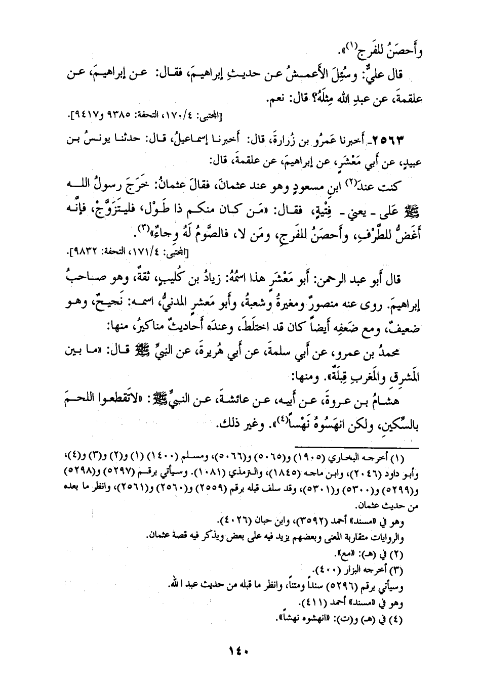 2563 - أَخْبَرَنَا عَمْرُو بْنُ زُرَارَةَ، قَالَ: أَخْبَرَنَا إِسْمَاعِيلُ، قَالَ: حَدَّثَنَا يُونُسُ بْنُ عُبَيْدٍ عَنْ أَبِي مَعْشَرٍ عَنْ إِبْرَاهِيمَ، عَنْ عَلْقَمَةَ، قَالَ: كُنْتُ عِنْدَ ابْنِ مَسْعُودٍ وَهُوَ عِنْدَ عُثْمَانَ، فَقَالَ عُثْمَانُ: خَرَجَ رَسُولُ اللهِ صَلَّى اللهُ عَلَيْهِ وَسَلَّمَ عَلَى يَعْنِي فِتْيةٍ فَقَالَ: «§مَنْ كَانَ مِنْكُمْ ذَا طَوْلٍ فَلْيَتَزَوَّجْ فَإِنَّهُ أَغَضُّ لِلطَّرْفِ، وَأَحْصَنُ لِلْفَرْجِ، وَمَنْ لَا، فَالصَّوْمُ لَهُ وِجَاءٌ» قَالَ أَبُو عَبْدِ الرَّحْمَنِ: أَبُو مَعْشَرٍ هَذَا اسْمُهُ زِيَادُ بْنُ كُلَيْبٍ ثِقَةٌ، وَهُوَ صَاحِبُ إِبْرَاهِيمَ، رَوَى عَنْهُ مَنْصُورٌ، وَمُغِيرَةُ، وَشُعْبَةُ، وَأَبُو مَعْشَرٍ الْمَدَنِيُّ اسْمُهُ نَجِيحٌ وَهُوَ ضَعِيفٌ، وَمَعَ ضَعْفِهِ أَيْضًا كَانَ قَدِ اخْتَلَطَ، وعِنْدَهُ أَحَادِيثُ مَنَاكِيرُ مِنْهَا مُحَمَّدُ بْنُ عَمْرٍو، عَنْ أَبِي سَلَمَةَ، عَنْ أَبِي هُرَيْرَةَ عَنِ النَّبِيِّ صَلَّى اللهُ عَلَيْهِ وَسَلَّمَ قَالَ: «مَا بَيْنَ الْمَشْرِقِ وَالْمَغْرِبِ قِبْلَةٌ» ومنها