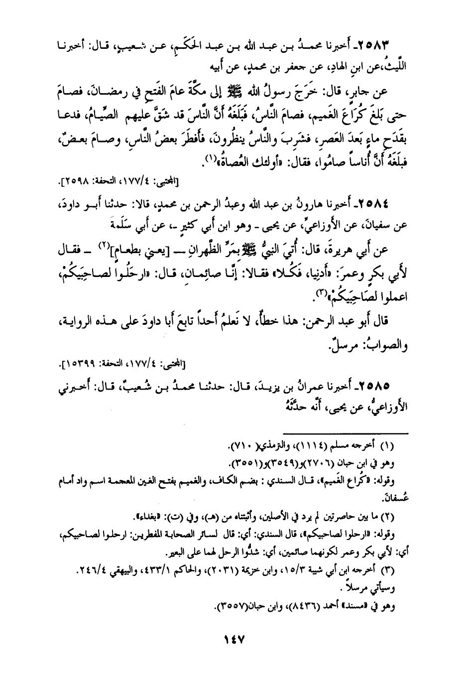 2584 - أَخْبَرَنَا هَارُونُ بْنُ عَبْدِ اللهِ، وَعَبْدُ الرَّحْمَنِ بْنُ مُحَمَّدٍ قَالَا: حَدَّثَنَا أَبُو دَاوُدَ، عَنْ سُفْيَانَ، عَنِ الْأَوْزَاعِيِّ، عَنْ يَحْيَى وَهُوَ ابْنُ أَبِي كَثِيرٍ، عَنْ أَبِي سَلَمَةَ، عَنْ أَبِي هُرَيْرَةَ، قَالَ: أُتِيَ النَّبِيُّ صَلَّى اللهُ عَلَيْهِ وَسَلَّمَ بِمَرِّ الظَّهْرَانِ يَعْنِي بِطَعَامٍ، فَقَالَ لِأَبِي بَكْرٍ وَعُمَرَ: «ادْنُوَا فَكُلَا» فَقَالَا: إِنَّا صَائِمَانِ، قَالَ: «§ارْحَلُوا لِصَاحِبِكُمْ اعْمَلُوا لِصَاحِبِكُمْ» قَالَ أَبُو عَبْدِ الرَّحْمَنِ: هَذَا خَطَأٌ، لَا نَعْلَمُ أَحَدًا تَابَعَ أَبَا دَاوُدَ عَلَى هَذِهِ الرِّوَايَةِ، وَالصَّوَابُ مُرْسَلٌ