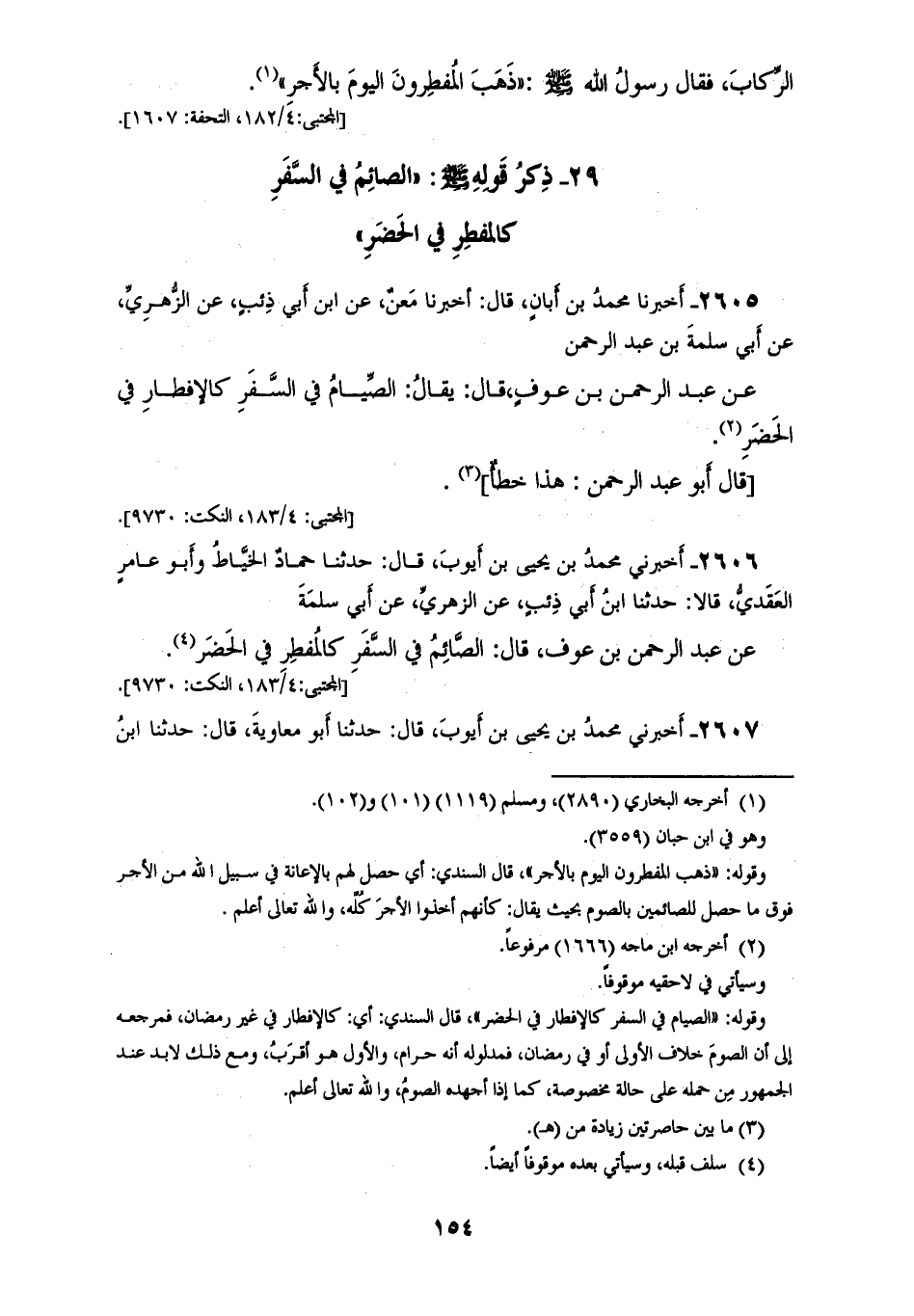 2606 - أَخْبَرَنِي مُحَمَّدُ بْنُ يَحْيَى بْنِ أَيُّوبَ، قَالَ: حَدَّثَنَا حَمَّادٌ الْخَيَّاطُ، وَأَبُو عَامِرٍ الْعَقَدِيُّ، قَالَا: حَدَّثَنَا ابْنُ أَبِي ذِئْبٍ، عَنِ الزُّهْرِيِّ، عَنْ أَبِي سَلَمَةَ، عَنْ عَبْدِ الرَّحْمَنِ بْنِ عَوْفٍ، قَالَ: «§الصَّائِمُ فِي السَّفَرِ كَالْمُفْطِرِ فِي الْحَضَرِ»