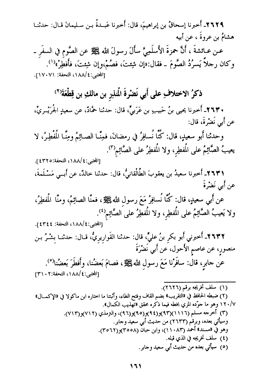 2631 - أَخْبَرَنَا سَعِيدُ بْنُ يَعْقُوبَ الطَّالْقانيُّ، قَالَ: حَدَّثَنَا خَالِدٌ، عَنْ أَبِي مَسْلَمَةَ، عَنْ أَبِي نَضْرَةَ، عَنْ أَبِي سَعِيدٍ، قَالَ: «§كُنَّا نُسَافِرُ مَعَ رَسُولِ اللهِ صَلَّى اللهُ عَلَيْهِ وَسَلَّمَ فَمِنَّا الصَّائِمُ وَمِنَّا الْمُفْطِرُ، وَلَا يَعِيبُ الصَّائِمُ عَلَى الْمُفْطِرِ، وَلَا الْمُفْطِرُ عَلَى الصَّائِمِ»