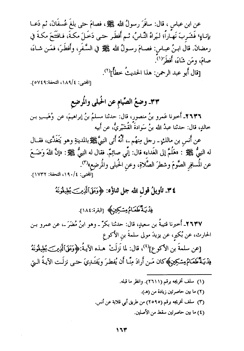 2637 - أَخْبَرَنَا قُتَيْبَةُ بْنُ سَعِيدٍ، قَالَ: حَدَّثَنَا بَكْرٌ وَهُوَ ابْنُ مُضَرَ، عَنْ عَمْرِو بْنِ الْحَارِثِ، عَنْ بُكَيْرٍ، عَنْ يَزِيدَ، مَوْلَى سَلَمَةَ بْنِ الْأَكْوَعِ، عَنْ سَلَمَةَ بْنِ الْأَكْوَعِ، قَالَ: " لَمَّا نَزَلَتْ هَذِهِ الْآيَةُ {§وَعَلَى الَّذِينَ يُطِيقُونَهُ فِدْيَةٌ طَعَامُ مِسْكِينٍ} [البقرة: 184] كَانَ مَنْ أَرَادَ مِنَّا أَنْ يُفْطِرَ وَيَفْتَدِيَ حَتَّى نَزَلَتِ الْآيَةُ الَّتِي بَعْدَهَا فَنَسَخَتْهَا "