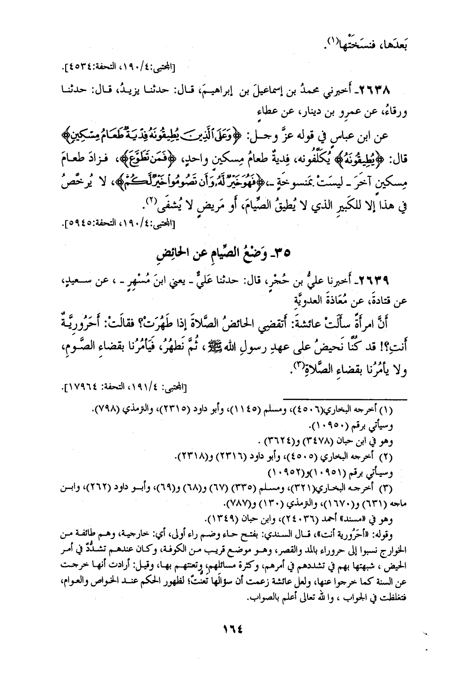 2639 - أَخْبَرَنَا عَلِيُّ بْنُ حُجْرٍ، قَالَ: حَدَّثَنَا عَلِيُّ يعني ابْنَ مُسْهِرٍ، عَنْ سَعِيدٍ، عَنْ قَتَادَةَ، عَنْ مُعَاذَةَ الْعَدَوِيَّةِ، أَنَّ امْرَأَةً سَأَلَتْ عَائِشَةَ، أَتَقْضِي الْحَائِضُ الصَّلَاةَ إِذَا طَهُرَتْ؟ فَقَالَتْ: «أَحَرُورِيَّةٌ أَنْتِ؟ قَدْ §كُنَّا نَحِيضُ عَلَى عَهْدِ رَسُولِ اللهِ صَلَّى اللهُ عَلَيْهِ وَسَلَّمَ، ثُمَّ نَطْهُرُ فَيَأْمُرُنَا بِقَضَاءِ الصَّوْمِ، وَلَا يَأْمُرُنَا بِقَضَاءِ الصَّلَاةِ»