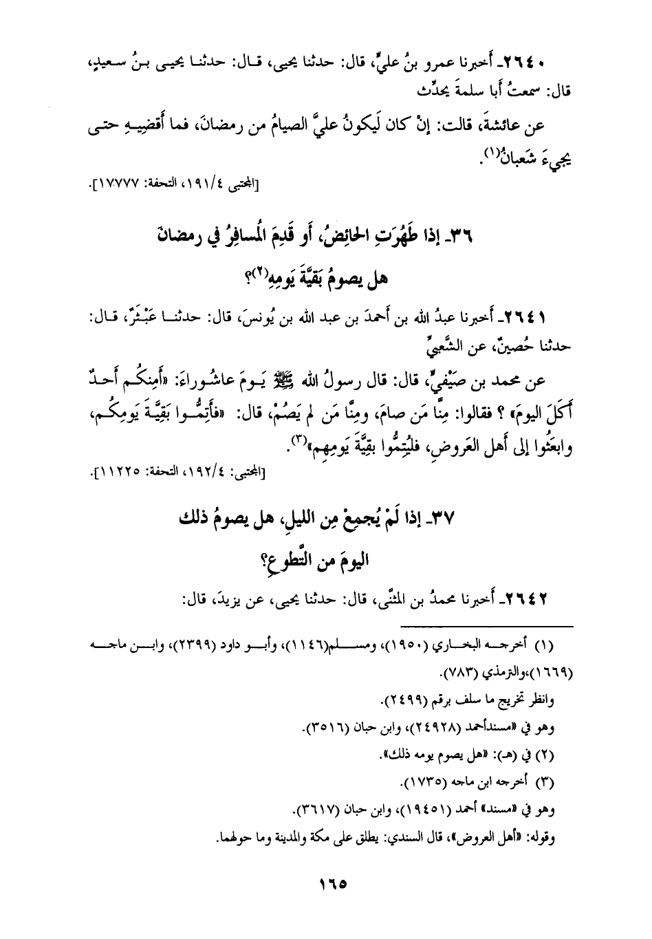 2641 - أَخْبَرَنَا عَبْدُ اللهِ بْنُ أَحْمَدَ بْنِ عَبْدِ اللهِ بْنِ يُونُسَ، قَالَ: حَدَّثَنَا عَبْثَرٌ، قَالَ: حَدَّثَنَا حُصَيْنٌ، عَنِ الشَّعْبِيِّ، عَنْ مُحَمَّدِ بْنِ صَيْفِيٍّ، قَالَ: قَالَ رَسُولُ اللهِ صَلَّى اللهُ عَلَيْهِ وَسَلَّمَ يَوْمَ عَاشُورَاءَ: «أَمِنْكُمْ أَحَدٌ أَكَلَ الْيَوْمَ؟» فَقَالُوا: مِنَّا مَنْ صَامَ، وَمِنَّا مَنْ لَمْ يَصُمْ، قَالَ: «§فَأَتِمُّوا بَقِيَّةَ يَوْمِكُمْ، وَابْعَثُوا إِلَى أَهْلِ الْعُرُوضِ فَلْيُتِمُّوا بَقِيَّةَ يَوْمِهِمْ»