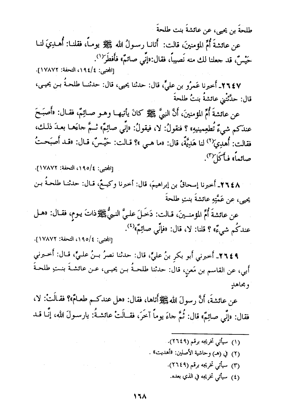 2646 - حَدَّثَنَا أَحْمَدُ بْنُ حَرْبٍ، قَالَ: حَدَّثَنَا قَاسِمٌ، قَالَ: حَدَّثَنَا سُفْيَانُ، عَنْ طَلْحَةَ بْنِ يَحْيَى، عَنْ عَائِشَةَ بِنْتِ طَلْحَةَ، عَنْ عَائِشَةَ أُمِّ الْمُؤْمِنِينَ، قَالَتْ: أَتَانَا رَسُولُ اللهِ صَلَّى اللهُ عَلَيْهِ وَسَلَّمَ يَوْمًا فَقُلْنَا: أُهْدِيَ لَنَا حَيْسٌ قَدْ جَعَلْنَا لَكَ مِنْهُ نَصِيبًا، فَقَالَ: «§إِنِّي صَائِمٌ» فَأَفْطَرَ