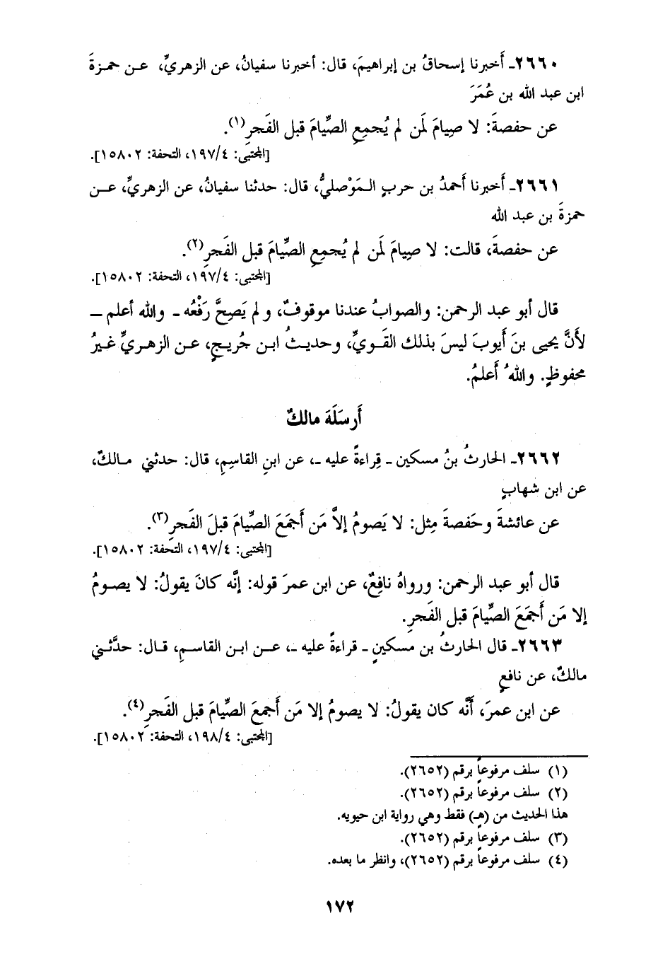 2662 - الْحَارِثُ بْنُ مِسْكِينٍ، قِرَاءَةً عَلَيْهِ، عَنِ ابْنِ الْقَاسِمِ، قَالَ: حَدَّثَنِي مَالِكٌ، عَنِ ابْنِ شِهَابٍ، عَنْ عَائِشَةَ، وَحَفْصَةَ مثل، «§لَا يَصُومُ إِلَّا مَنْ أَجْمَعَ الصِّيَامَ قَبْلَ الْفَجْرِ» قَالَ أَبُو عَبْدِ الرَّحْمَنِ: وَرَوَاهُ نَافِعٌ، عَن ابْنِ عُمَرَ قَوْلَهُ: إِنَّهُ كَانَ يَقُولُ: لَا يَصُومُ إِلَّا مَنْ أَجْمَعَ الصِّيَامَ قَبْلَ الْفَجْرِ