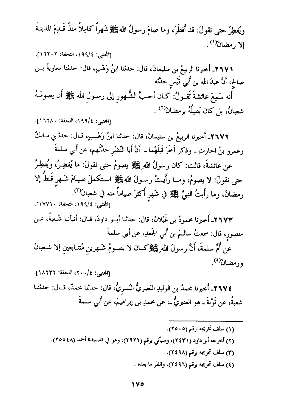 2672 - أَخْبَرَنَا الرَّبِيعُ بْنُ سُلَيْمَانَ، قَالَ: حَدَّثَنَا ابْنُ وَهْبٍ، قَالَ: حَدَّثَنِي مَالِكٌ، وَعَمْرُو بْنُ الْحَارِثِ، وَذَكَرَ آخَرَ قَبْلَهُمَا أَنَّ أَبَا النَّضْرِ، حَدَّثَهُمْ عَنْ أَبِي سَلَمَةَ، عَنْ عَائِشَةَ، قَالَتْ: «§كَانَ رَسُولُ اللهِ صَلَّى اللهُ عَلَيْهِ وَسَلَّمَ يَصُومُ حَتَّى نَقُولَ مَا يُفْطِرُ، وَيُفْطِرُ حَتَّى نَقُولَ لَا يَصُومُ، وَمَا رَأَيْتُ رَسُولَ اللهِ صَلَّى اللهُ عَلَيْهِ وَسَلَّمَ اسْتَكْمَلَ صِيَامَ شَهْرٍ قَطُّ إِلَّا رَمَضَانَ، وَمَا رَأَيْتُ النَّبِيَّ صَلَّى اللهُ عَلَيْهِ وَسَلَّمَ فِي شَهْرٍ أَكْثَرَ صِيَامًا مِنْهُ فِي شَعْبَانَ»