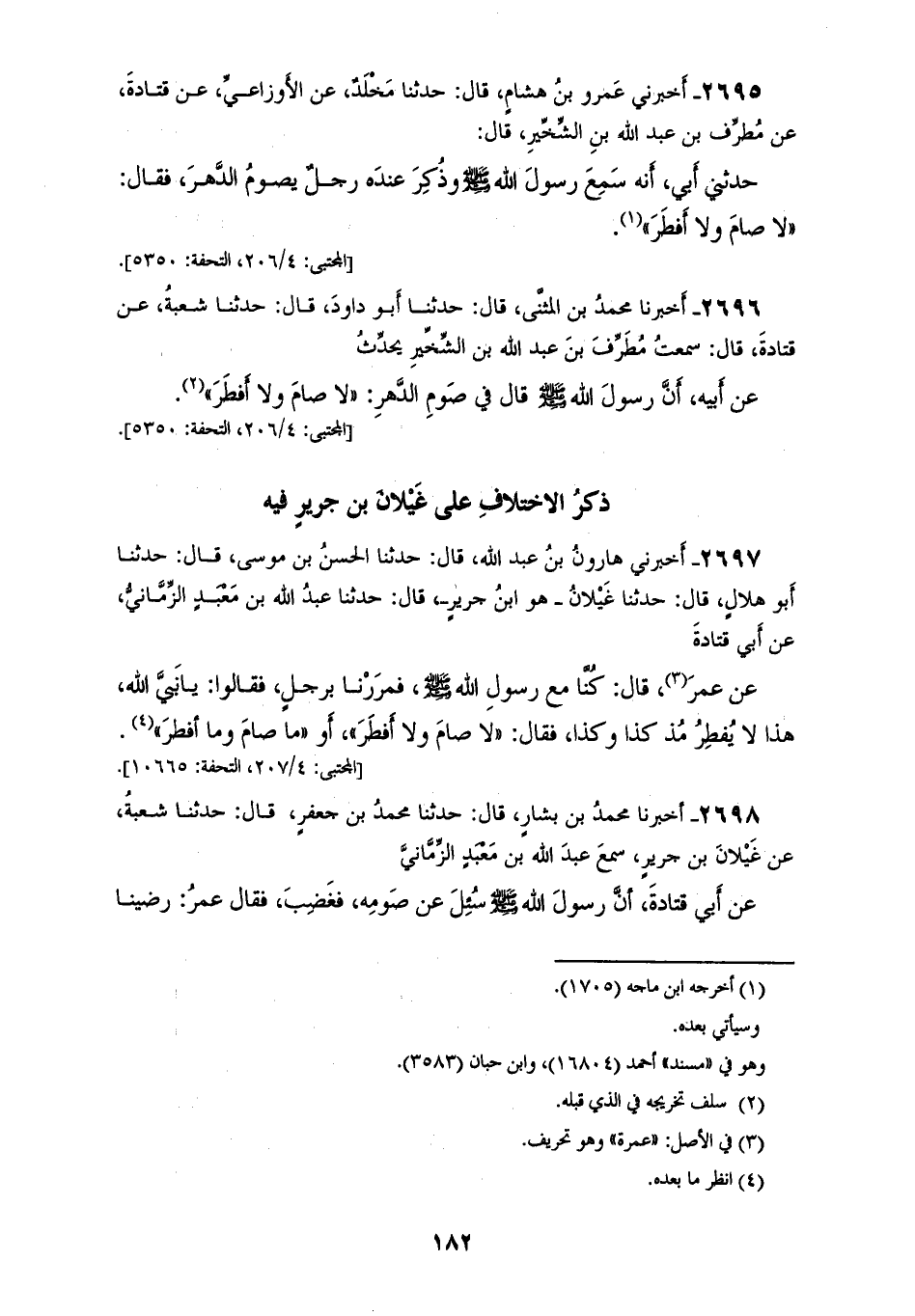 2697 - أَخْبَرَنِي هَارُونُ بْنُ عَبْدِ اللهِ، قَالَ: حَدَّثَنَا الْحَسَنُ بْنُ مُوسَى، قَالَ: حَدَّثَنَا أَبُو هِلَالٍ، قَالَ: حَدَّثَنَا غَيْلَانُ هُوَ ابْنُ جَرِيرٍ قَالَ: حَدَّثَنَا عَبْدُ اللهِ بْنُ مَعْبَدٍ الزِّمَّانِيُّ، عَنْ أَبِي قَتَادَةَ، عَنْ عُمَرَ، قَالَ: كُنَّا مَعَ رَسُولِ اللهِ صَلَّى اللهُ عَلَيْهِ وَسَلَّمَ فَمَرَرْنَا بِرَجُلٍ فَقَالُوا: يَا نَبِيَّ اللهِ، هَذَا لَا يُفْطِرُ مُذْ كَذَا وَكَذَا، فَقَالَ: «§لَا صَامَ وَلَا أَفْطَرَ، أَوْ مَا صَامَ وَمَا أَفْطَرَ»