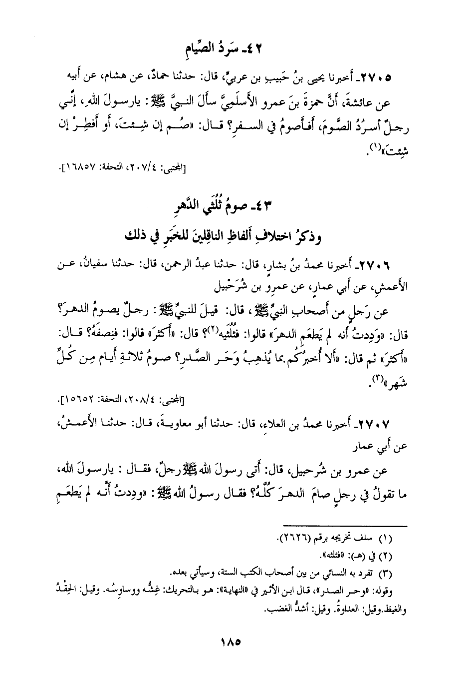 2706 - أَخْبَرَنَا مُحَمَّدُ بْنُ بَشَّارٍ، قَالَ: حَدَّثَنَا عَبْدُ الرَّحْمَنِ، قَالَ: حَدَّثَنَا سُفْيَانُ، عَنِ الْأَعْمَشِ، عَنْ أَبِي عَمَّارٍ، عَنْ عَمْرِو بْنِ شُرَحْبِيلَ، عَنْ رَجُلٍ، مِنْ أَصْحَابِ النَّبِيِّ صَلَّى اللهُ عَلَيْهِ وَسَلَّمَ قَالَ: قِيلَ لِلنَّبِيِّ صَلَّى اللهُ عَلَيْهِ وَسَلَّمَ: رَجُلٌ يَصُومُ الدَّهْرَ، قَالَ: «وَدِدْتُ أَنَّهُ لَمْ يَطْعَمِ الدَّهْرَ» قَالُوا: فَثُلُثَيْهِ؟ قَالَ: «أَكْثَرَ» قَالُوا: فَنِصْفُهُ؟ قَالَ: «أَكْثَرَ» ثُمَّ قَالَ: «§أَلَا أُخْبِرُكُمْ بِمَا يُذْهِبُ وَحَرَ الصَّدْرِ؟ صَوْمُ ثَلَاثَةِ أَيَّامٍ مِنْ كُلِّ شَهْرٍ»