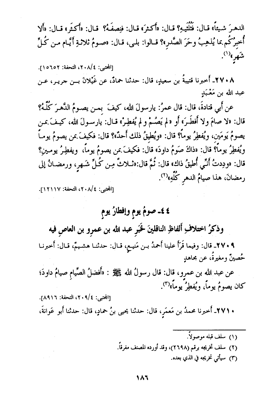 2708 - أَخْبَرَنَا قُتَيْبَةُ بْنُ سَعِيدٍ، قَالَ: حَدَّثَنَا حَمَّادٌ، عَنْ غَيْلَانَ بْنِ جَرِيرٍ، عَنْ عَبْدِ اللهِ بْنِ مَعْبَدٍ، عَنْ أَبِي قَتَادَةَ، قَالَ: قَالَ عُمَرُ: يَا رَسُولَ اللهِ، كَيْفَ بِمَنْ يَصُومُ الدَّهْرَ كُلَّهُ؟ قَالَ: «لَا صَامَ وَلَا أَفْطَرَ، أَوْ لَمْ يَصُمْ وَلَمْ يُفْطِرْ» قَالَ: يَا رَسُولَ اللهِ، كَيْفَ بِمَنْ يَصُومُ يَوْمَيْنِ وَيُفْطِرُ يَوْمًا؟ قَالَ: «وَيُطِيقُ ذَلِكَ أَحَدٌ؟» قَالَ: فَكَيْفَ بِمَنْ يَصُومُ يَوْمًا وَيُفْطِرُ يَوْمًا؟ قَالَ: «ذَاكَ صَوْمُ دَاوُدَ» قَالَ: فَكَيْفَ بِمَنْ يَصُومُ يَوْمًا وَيُفْطِرُ يَوْمَيْنِ؟ قَالَ: «وَدِدْتُ أَنِّي أُطِيقُ ذَاكَ» قَالَ: ثُمَّ قَالَ: «§ثَلَاثٌ مِنْ كُلِّ شَهْرٍ، وَرَمَضَانُ إِلَى رَمَضَانَ هَذَا صِيَامُ الدَّهْرِ كُلَّهُ»
