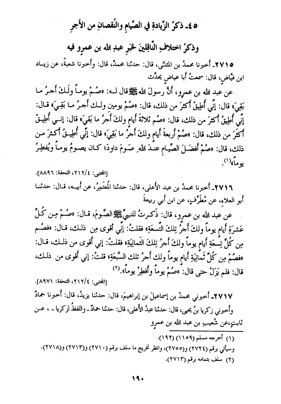 2716 - أَخْبَرَنَا مُحَمَّدُ بْنُ عَبْدِ الْأَعْلَى، قَالَ: حَدَّثَنَا الْمُعْتَمِرُ، عَنْ أَبِيهِ، قَالَ: حَدَّثَنَا أَبُو الْعَلَاءِ، عَنْ مُطَرِّفٍ، عَنِ ابْنِ أَبِي رَبِيعَةَ، عَنْ عَبْدِ اللهِ بْنِ عَمْرٍو، قَالَ ذَكَرْتُ لِلنَّبِيِّ صَلَّى اللهُ عَلَيْهِ وَسَلَّمَ الصَّوْمَ قَالَ: «صُمْ مِنْ كُلِّ عَشَرَةِ أَيَّامٍ يَوْمًا وَلَكَ أَجْرُ تِلْكَ التِّسْعَةِ» فَقُلْتُ: إِنِّي أَقْوَى مِنْ ذَلِكَ، قَالَ: «فَصُمْ مِنْ كُلِّ تِسْعَةِ أَيَّامٍ يَوْمًا وَلَكَ أَجْرُ تِلْكَ الثَّمَانِيَةِ» فَقُلْتُ: إِنِّي أَقْوَى مَنْ ذَلِكَ، قَالَ: «فَصُمْ مِنْ كُلِّ ثَمَانِيَةِ أَيَّامٍ يَوْمًا وَلَكَ أَجْرُ تِلْكَ السَّبْعَةِ» قُلْتُ: إِنِّي أَقْوَى مِنْ ذَلِكَ، قَالَ: فَلَمْ يَزَلْ حَتَّى قَالَ: «§صُمْ يَوْمًا وَأَفْطِرْ يَوْمًا»