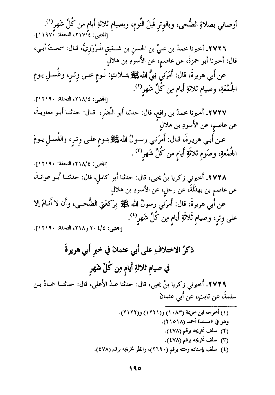 2728 - أَخْبَرَنِي زَكَرِيَّا بْنُ يَحْيَى، قَالَ: حَدَّثَنَا أَبُو كَامِلٍ، قَالَ: حَدَّثَنَا أَبُو عَوَانَةَ، عَنْ عَاصِمِ ابْنِ بَهْدَلَةَ، عَنْ رَجُلٍ، عَنِ الْأَسْوَدِ بْنِ هِلَالٍ، عَنْ أَبِي هُرَيْرَةَ، قَالَ: «§أَمَرَنِي رَسُولُ اللهِ صَلَّى اللهُ عَلَيْهِ وَسَلَّمَ بِرَكْعَتَيِ الضُّحَى، وَأَنْ لَا أَنَامَ إِلَّا عَلَى وِتْرٍ، وَصِيَامِ ثَلَاثَةِ أَيَّامٍ مِنْ كُلِّ شَهْرٍ»