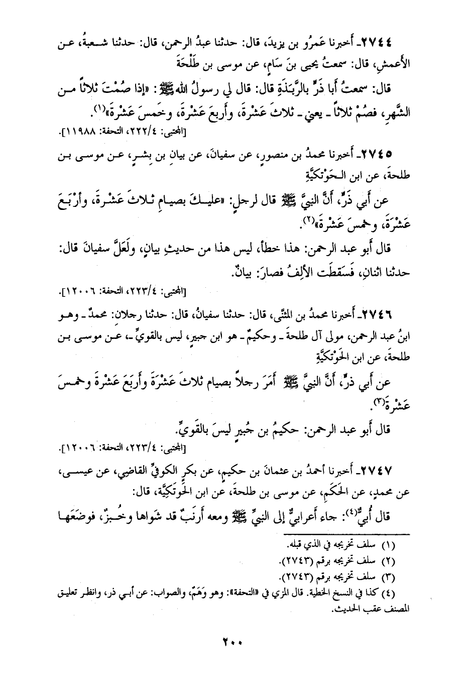 2745 - أَخْبَرَنَا مُحَمَّدُ بْنُ مَنْصُورٍ، عَنْ سُفْيَانَ، عَنْ بَيَانِ بْنِ بِشْرٍ، عَنْ مُوسَى بْنِ طَلْحَةَ، عَنِ ابْنِ الْحَوْتَكِيَّةِ، عَنْ أَبِي ذَرٍّ، أَنَّ النَّبِيَّ صَلَّى اللهُ عَلَيْهِ وَسَلَّمَ قَالَ لِرَجُلٍ: «§عَلَيْكَ بِصِيَامِ ثَلَاثَ عَشْرَةَ، وَأَرْبَعَ عَشْرَةَ، وَخَمْسَ عَشْرَةَ» قَالَ أَبُو عَبْدِ الرَّحْمَنِ: هَذَا خَطَأٌ لَيْسَ هَذَا مِنْ حَدِيثِ بَيَانٍ، وَلَعَلَّ سُفْيَانَ قَالَ: حَدَّثَنَا اثْنَانِ فَسَقَطَتِ الْأَلِفُ فَصَارَ بَيَانٌ