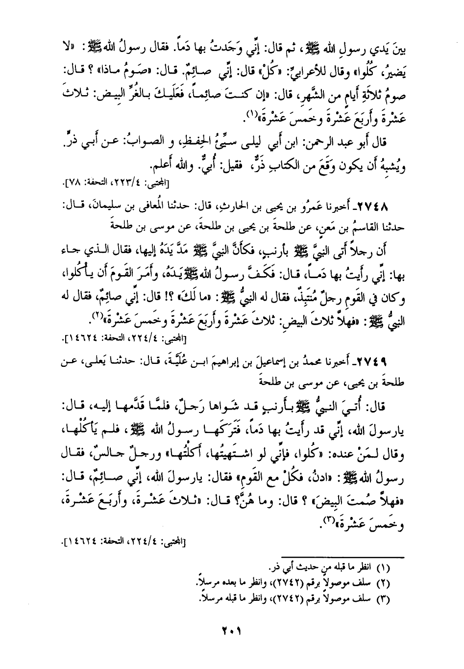 2749 - أَخْبَرَنَا مُحَمَّدُ بْنُ إِسْمَاعِيلَ بْنِ إِبْرَاهِيمَ ابْنِ عُلَيَّةَ، قَالَ: حَدَّثَنَا يَعْلَى، عَنْ طَلْحَةَ بْنِ يَحْيَى، عَنْ مُوسَى بْنِ طَلْحَةَ، قَالَ: أُتِيَ النَّبِيُّ صَلَّى اللهُ عَلَيْهِ وَسَلَّمَ بِأَرْنَبٍ قَدْ شَوَاهَا رَجُلٌ، فَلَمَّا قَدَّمَهَا إِلَيْهِ قَالَ: يَا رَسُولَ اللهِ، إِنِّي رَأَيْتُ بِهَا دَمًا، فَتَرَكَهَا رَسُولُ اللهِ صَلَّى اللهُ عَلَيْهِ وَسَلَّمَ فَلَمْ يَأْكُلْهَا، وَقَالَ لِمَنْ عِنْدَهُ: «كُلُوا فَإِنِّي لَوْ اشْتَهَيْتُهَا أَكَلْتُهَا» وَرَجُلٌ جَالِسٌ: فَقَالَ رَسُولُ اللهِ صَلَّى اللهُ عَلَيْهِ وَسَلَّمَ: «ادْنُ فَكُلْ مَعَ الْقَوْمِ» فَقَالَ: يَا رَسُولَ اللهِ، إِنِّي صَائِمٌ، قَالَ: «§فَهَلَّا صُمْتَ الْبِيضَ؟» قَالَ: وَمَا هُنَّ؟ قَالَ: «ثَلَاثَ عَشْرَةَ، وَأَرْبَعَ عَشْرَةَ، وَخَمْسَ عَشْرَةَ»