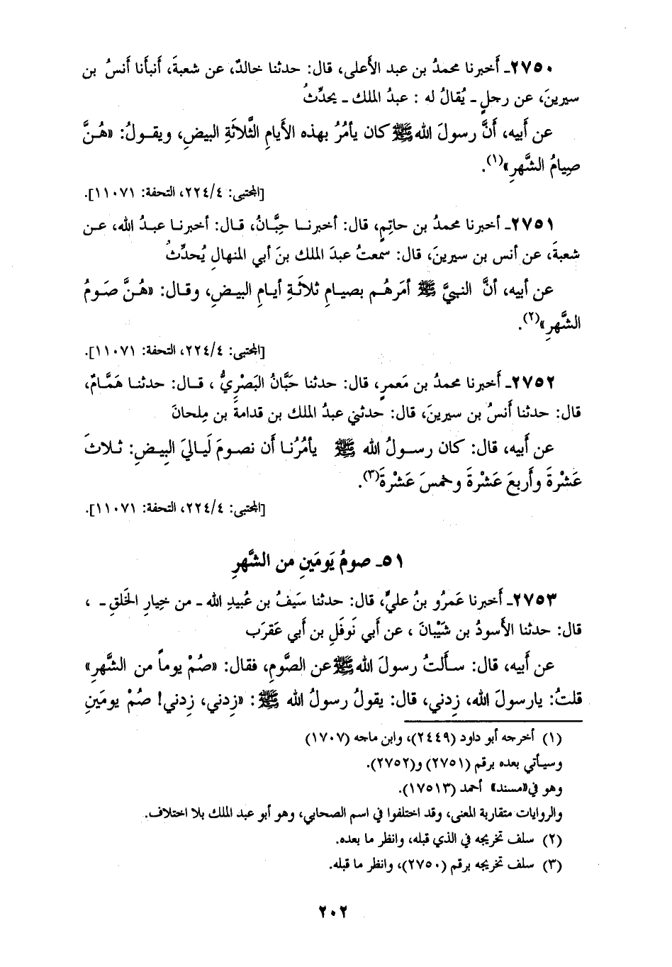2751 - أَخْبَرَنَا مُحَمَّدُ بْنُ حَاتِمٍ، قَالَ: أَخْبَرَنَا حِبَّانُ، قَالَ: أَخْبَرَنَا عَبْدُ اللهِ، عَنْ شُعْبَةَ، عَنْ أَنَسِ بْنِ سِيرِينَ، قَالَ: سَمِعْتُ عَبْدَ الْمَلِكِ بْنَ أَبِي الْمِنْهَالِ، يُحَدِّثُ عَنْ أَبِيهِ، أَنَّ النَّبِيَّ صَلَّى اللهُ عَلَيْهِ وَسَلَّمَ أَمَرَهُمْ بِصِيَامِ ثَلَاثَةِ أَيَّامٍ الْبِيضِ وَقَالَ: «§هُنَّ صَوْمُ الشَّهْرِ»