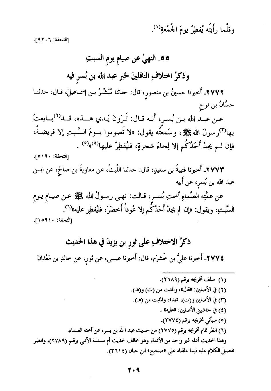 2774 - أَخْبَرَنَا عَلِيُّ بْنُ خَشْرَمٍ، قَالَ: أَخْبَرَنَا عِيسَى، عَنْ ثَوْرٍ، عَنْ خَالِدِ بْنِ مَعْدَانَ، عَنْ عَبْدِ اللهِ بْنِ بُسْرٍ، قَالَ: قَالَ رَسُولُ اللهِ صَلَّى اللهُ عَلَيْهِ وَسَلَّمَ: «§لَا تَصُومُوا يَوْمَ السَّبْتِ إِلَّا فِيمَا افْتُرِضَ عَلَيْكُمْ»