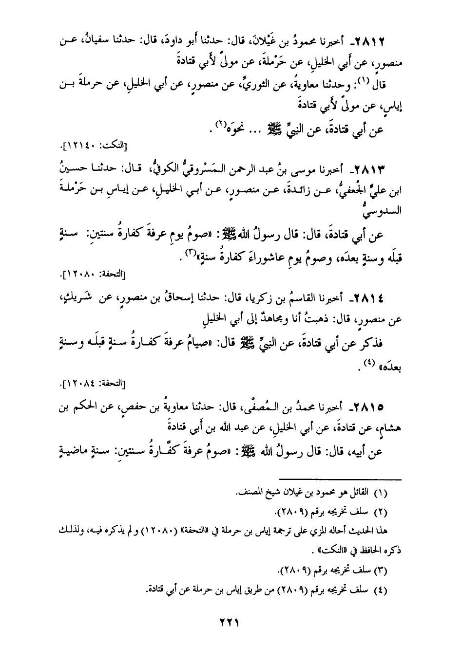 2814 - أَخْبَرَنَا الْقَاسِمُ بْنُ زَكَرِيَّا، قَالَ: حَدَّثَنَا إِسْحَاقُ بْنُ مَنْصُورٍ، عَنْ شَرِيكٍ، عَنْ مَنْصُورٍ، قَالَ: ذَهَبْتُ أنا وَمُجَاهِدٌ، إِلَى أَبِي الْخَلِيلِ، فَذَكَرَ عَنْ أَبِي قَتَادَةَ، عَنِ النَّبِيِّ صَلَّى اللهُ عَلَيْهِ وَسَلَّمَ قَالَ: «§صِيَامُ عَرَفَةَ كَفَّارَةُ سَنَةٍ قَبْلَهُ وَسَنَةٍ بَعْدَهُ»