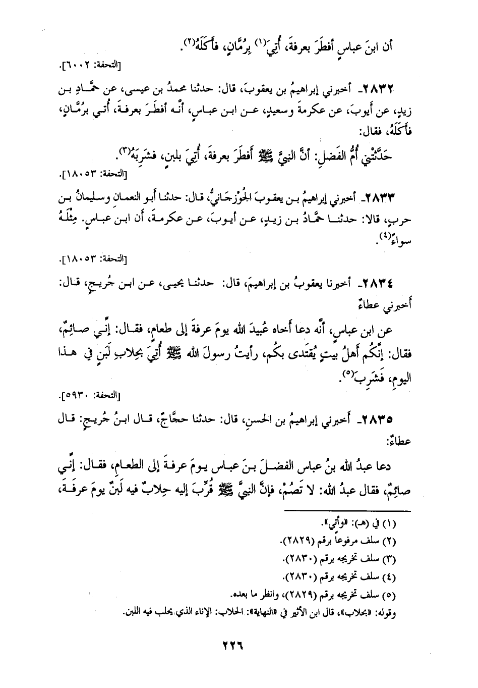 2835 - أَخْبَرَنِي إِبْرَاهِيمُ بْنُ الْحَسَنِ، قَالَ: حَدَّثَنَا حَجَّاجٌ، قَالَ: ابْنُ جُرَيْجٍ قَالَ: عَطَاءٌ دَعَا عَبْدُ اللهِ بْنُ عَبَّاسٍ الْفَضْلَ بْنَ عَبَّاسٍ، يَوْمَ عَرَفَةَ إِلَى الطَّعَامِ، فَقَالَ: إِنِّي صَائِمٌ، فَقَالَ عَبْدُ اللهِ: لَا تَصُمْ، فَإِنَّ النَّبِيَّ صَلَّى اللهُ عَلَيْهِ وَسَلَّمَ قُرِّبَ إِلَيْهِ حِلَابٌ فِيهِ لَبَنٍ يَوْمَ عَرَفَةَ «§فَشَرِبَ مِنْهُ، فَلَا تَصُمْ، فَإِنَّ النَّاسَ يَسْتَنُّونَ بِكُمْ»