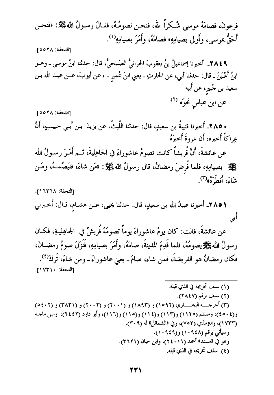 2850 - أَخْبَرَنَا قُتَيْبَةُ بْنُ سَعِيدٍ، قَالَ: حَدَّثَنَا اللَّيْثُ، عَنْ يَزِيدَ بْنِ أَبِي حَبِيبٍ، أَنَّ عِرَاكًا، أَخْبَرَهُ أَنَّ عُرْوَةَ أَخْبَرَهُ، عَنْ عَائِشَةَ، أَنَّ قُرَيْشًا كَانَتْ تَصُومُ عَاشُورَاءَ فِي الْجَاهِلِيَّةَ، ثُمَّ أَمَرَ رَسُولُ اللهِ صَلَّى اللهُ عَلَيْهِ وَسَلَّمَ بِصِيَامِهِ، فَلَمَّا فُرِضَ رَمَضَانُ قَالَ رَسُولُ اللهِ صَلَّى اللهُ عَلَيْهِ وَسَلَّمَ: «§مَنْ شَاءَ فَلْيَصُمْهُ وَمَنْ شَاءَ أَفْطَرَهُ»