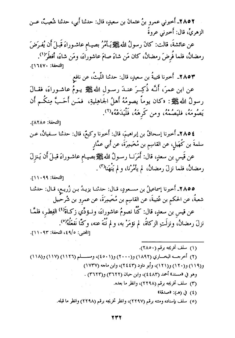 2855 - أَخْبَرَنَا إِسْمَاعِيلُ بْنُ مَسْعُودٍ، قَالَ: حَدَّثَنَا يَزِيدُ بْنُ زُرَيْعٍ، قَالَ: حَدَّثَنَا شُعْبَةُ، عَنِ الْحَكَمِ بْنِ عُتَيْبَةَ، عَنِ الْقَاسِمِ بْنِ مُخَيْمِرَةَ، عَنْ عَمْرِو بْنِ شُرَحْبِيلَ، عَنْ قَيْسٍ بْنِ سَعْدٍ، قَالَ: «§كُنَّا نَصُومُ عَاشُورَاءَ وَنُؤَدِّي زَكَاةَ الْفِطْرِ، فَلَمَّا نَزَلَ رَمَضَانُ وَنَزَلَتِ الزَّكَاةُ لَمْ نُؤْمَرْ بِهِ وَلَمْ نُنْهَ عَنْهُ، وَكُنَّا نَفْعَلُهُ»