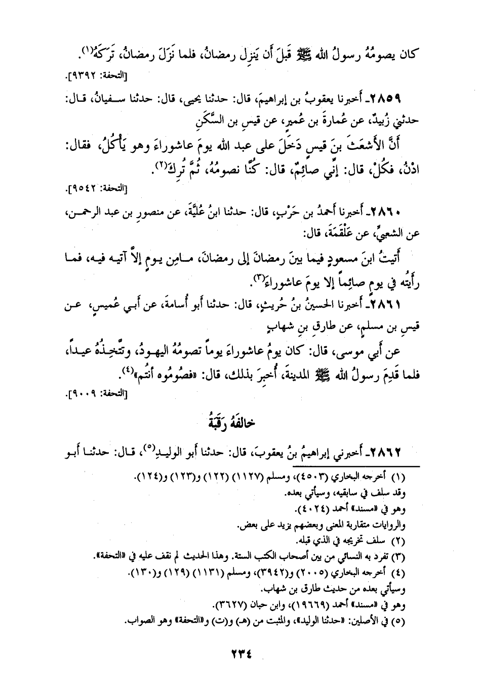 2861 - أَخْبَرَنَا الْحُسَيْنُ بْنُ حُرَيْثٍ، قَالَ: حَدَّثَنَا أَبُو أُسَامَةَ، عَنْ أَبِي عُمَيْسٍ، عَنْ قَيْسِ بْنِ مُسْلِمٍ، عَنْ طَارِقِ بْنِ شِهَابٍ، عَنْ أَبِي مُوسَى، قَالَ: كَانَ يَوْمُ عَاشُورَاءَ يَوْمًا تَصُومُهُ الْيَهُودُ وَتَتَّخِذُهُ عِيدًا، فَلَمَّا قَدِمَ رَسُولُ اللهِ صَلَّى اللهُ عَلَيْهِ وَسَلَّمَ الْمَدِينَةَ أُخْبِرَ بِذَلِكَ، قَالَ: «§فَصُومُوهُ أَنْتُمْ» خَالَفَهُ رَقَبَةُ