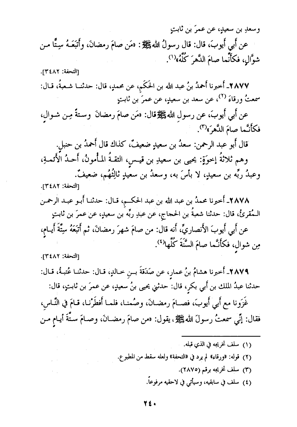 2878 - أَخْبَرَنَا مُحَمَّدُ بْنُ عَبْدِ اللهِ بْنِ عَبْدِ الْحَكَمِ، قَالَ: حَدَّثَنَا أَبُو عَبْدِ الرَّحْمَنِ الْمُقْرِئُ، قَالَ: حَدَّثَنَا شُعْبَةُ بْنُ الْحَجَّاجِ، عَنْ عَبْدِ رَبِّهِ بْنِ سَعِيدٍ، عَنْ عُمَرَ بْنِ ثَابِتٍ، عَنْ أَبِي أَيُّوبَ الْأَنْصَارِيِّ، أَنَّهُ قَالَ: «§مَنْ صَامَ شَهْرَ رَمَضَانَ ثُمَّ أَتْبَعَهُ سِتَّةَ أَيَّامٍ مِنْ شَوَّالٍ فَكَأَنَّمَا صَامَ السَّنَةَ كُلَّهَا»