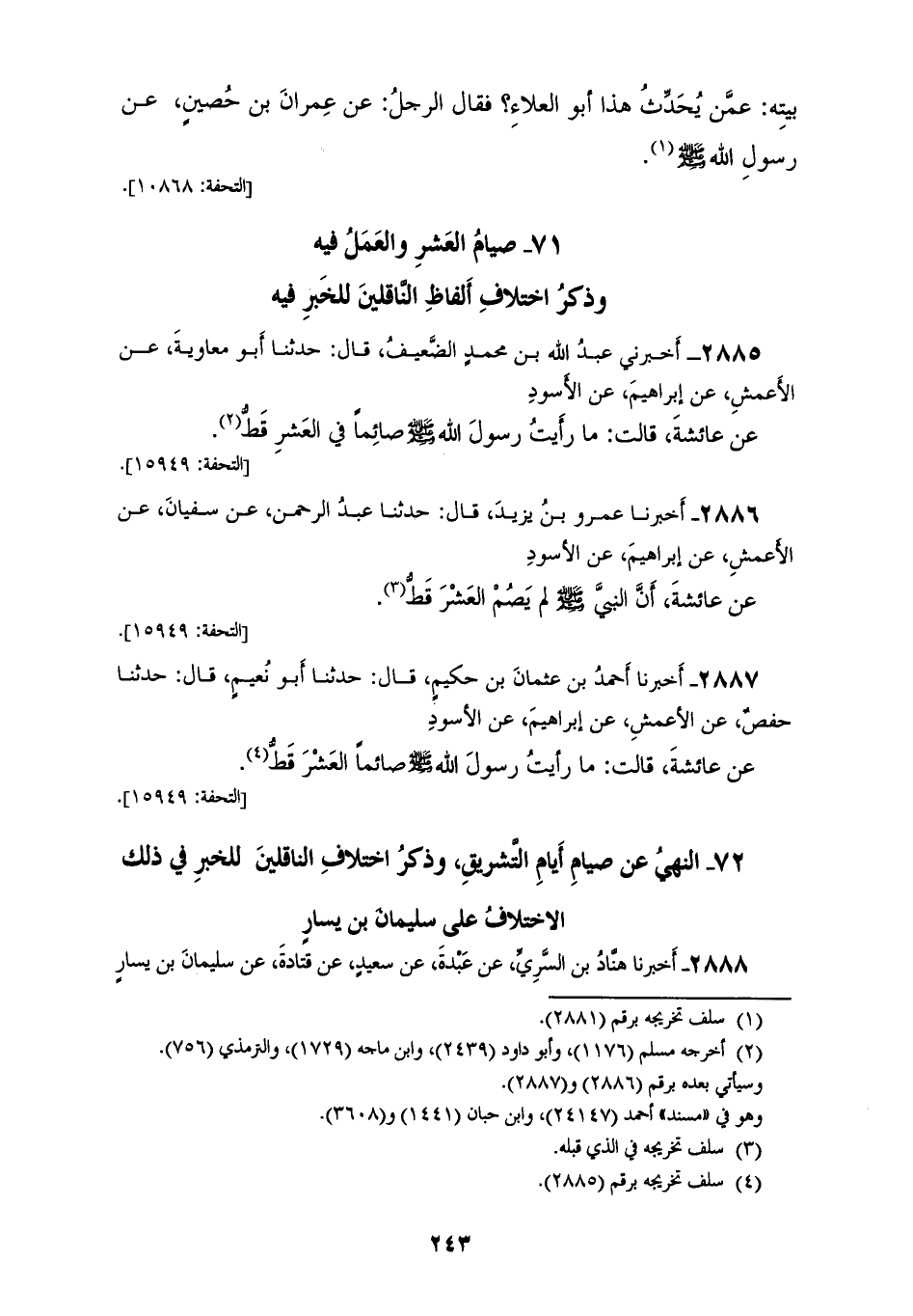 2886 - أَخْبَرَنَا عَمْرُو بْنُ يَزِيدَ، قَالَ: حَدَّثَنَا عَبْدُ الرَّحْمَنِ، عَنْ سُفْيَانَ، عَنِ الْأَعْمَشِ، عَنْ إِبْرَاهِيمَ، عَنِ الْأَسْوَدِ، عَنْ عَائِشَةَ، أَنَّ النَّبِيَّ صَلَّى اللهُ عَلَيْهِ وَسَلَّمَ «§لَمْ يَصُمِ الْعَشْرَ قَطُّ»