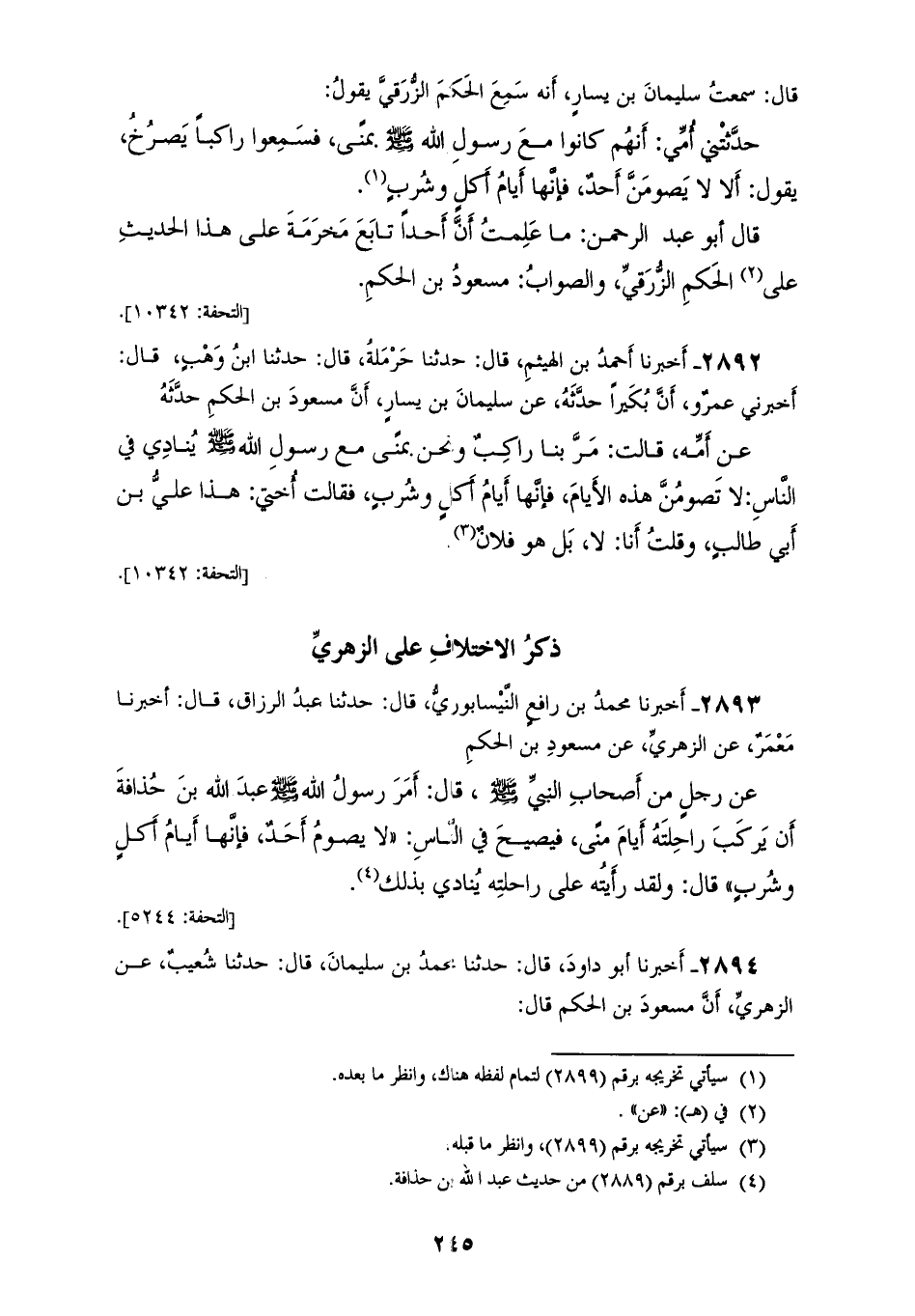 2891 - قَالَ أَبُو عَبْدِ الرَّحْمَنِ: بَلَغَنِي عَنِ ابْنِ وَهْبٍ، عَنْ مَخْرَمَةَ بْنِ بُكَيْرٍ، عَنْ أَبِيهِ، قَالَ: سَمِعْتُ سُلَيْمَانَ بْنَ يَسَارٍ، أَنَّهُ سَمِعَ الْحَكَمَ الزُّرَقِيَّ، يَقُولُ: حَدَّثَتْنِي أُمِّي، أَنَّهُمْ كَانُوا مَعَ رَسُولِ اللهِ صَلَّى اللهُ عَلَيْهِ وَسَلَّمَ بِمِنًى فَسَمِعُوا رَاكِبًا يَصْرُخُ يَقُولُ: «§أَلَا لَا يَصُومَنَّ أَحَدٌ، فَإِنَّهَا أَيَّامُ أَكْلٍ وَشُرْبٍ» قَالَ أَبُو عَبْدِ الرَّحْمَنِ: مَا عُلِّمْتُ أَنَّ أَحَدًا تَابَعَ مَخْرَمَةَ عَلَى هَذَا الْحَدِيثِ عَلَى الْحَكَمِ الزُّرَقِيِّ، وَالصَّوَابُ مَسْعُودُ بْنُ الْحَكَمِ