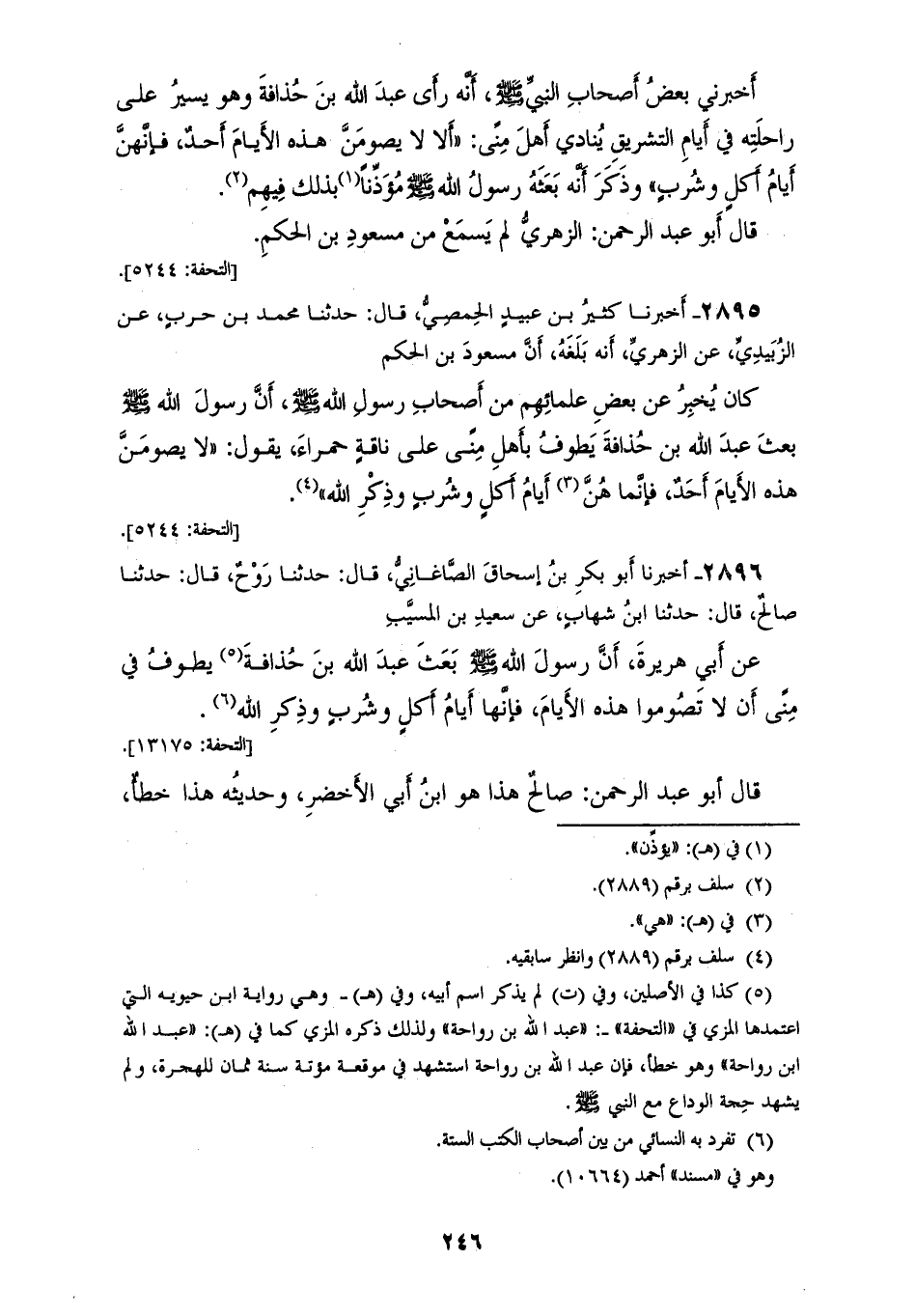 2896 - أَخْبَرَنَا أَبُو بَكْرِ بْنُ إِسْحَاقَ الصَّاغانِيُّ، قَالَ: حَدَّثَنَا رَوْحٌ، قَالَ: حَدَّثَنَا صَالِحٌ، قَالَ: حَدَّثَنَا ابْنُ شِهَابٍ، عَنْ سَعِيدِ بْنِ الْمُسَيِّبِ، عَنْ أَبِي هُرَيْرَةَ، أَنَّ رَسُولَ اللهِ صَلَّى اللهُ عَلَيْهِ وَسَلَّمَ «§بَعَثَ عَبْدَ اللهِ بْنَ حُذَافَةَ يَطُوفُ فِي مِنًى أَنْ لَا تَصُومُوا هَذِهِ الْأَيَّامَ فَإِنَّهَا أَيَّامُ أَكْلٍ وَشُرْبٍ وَذِكْرِ اللهِ» قَالَ أَبُو عَبْدِ الرَّحْمَنِ: صَالِحٌ هَذَا هُوَ ابْنُ أَبِي الْأَخْضَرِ وَحَدِيثُهُ هَذَا خَطَأٌ، لَا نَعْلَمُ أَحَدًا قَالَ فِي هَذَا: سَعِيدُ بْنُ الْمُسَيَّبِ، غَيْرَ صَالِحٍ وَهُوَ كَثِيرُ الْخَطَأِ ضَعِيفُ الْحَدِيثِ فِي الزُّهْرِيِّ، وَنَظِيرُهُ مُحَمَّدُ بْنُ أَبِي حَفْصَةَ وَكِلَاهُمَا ضَعِيفٌ وَرُوحُ بْنُ عُبَادَةَ لَيْسَ بِالْقَوِيِّ عندنا