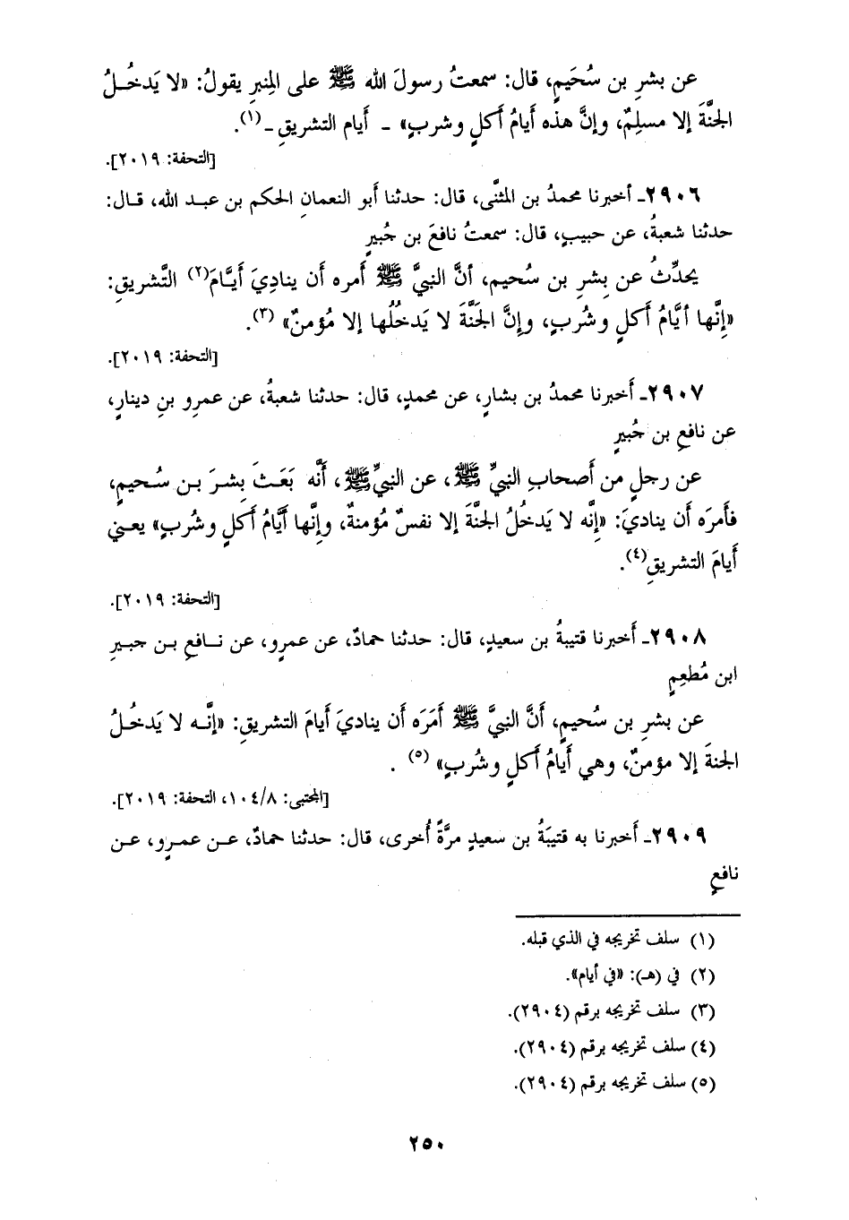 2908 - أَخْبَرَنَا قُتَيْبَةُ بْنُ سَعِيدٍ، قَالَ: حَدَّثَنَا حَمَّادٌ، عَنْ عَمْرٍو، عَنْ نَافِعِ بْنِ جُبَيْرِ بْنِ مُطْعِمٍ، عَنْ بِشْرِ بْنِ سُحَيْمٍ، أَنَّ النَّبِيَّ صَلَّى اللهُ عَلَيْهِ وَسَلَّمَ «§أَمْرَهُ أَنْ يُنَادِيَ أَيَّامَ التَّشْرِيقِ إِنَّهُ لَا يَدْخُلُ الْجَنَّةَ إِلَّا مُؤْمِنٌ، وَهِيَ أَيَّامُ أَكْلٍ وَشُرْبٍ»