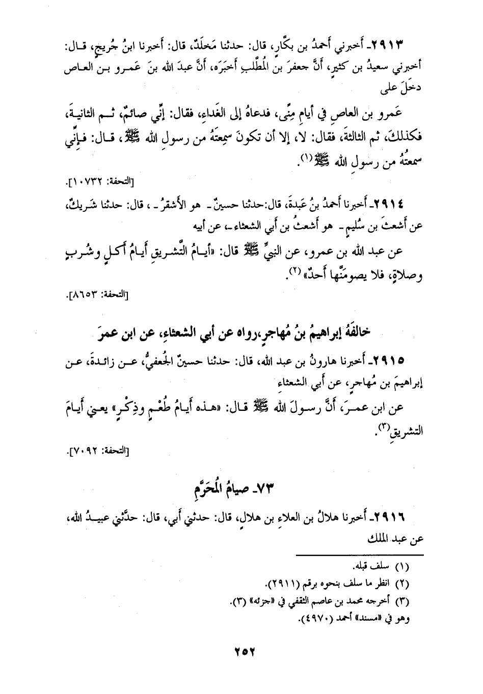 2915 - أَخْبَرَنَا هَارُونُ بْنُ عَبْدِ اللهِ، قَالَ: حَدَّثَنَا حُسَيْنٌ الْجُعْفِيُّ، عَنْ زَائِدَةَ، عَنْ إِبْرَاهِيمَ بْنِ مُهَاجِرٍ، عَنْ أَبِي الشَّعْثَاءِ، عَنِ ابْنِ عُمَرَ، أَنَّ رَسُولَ اللهِ صَلَّى اللهُ عَلَيْهِ وَسَلَّمَ قَالَ: «§هَذِهِ أَيَّامُ طُعْمٍ وَذِكْرٍ» يَعْنِي أَيَّامَ التَّشْرِيقِ
