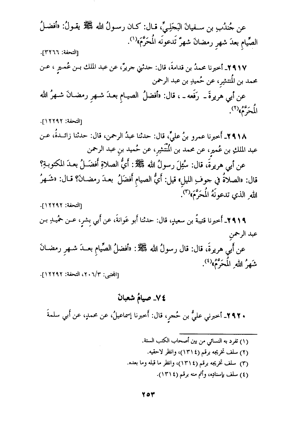 2919 - أَخْبَرَنَا قُتَيْبَةُ بْنُ سَعِيدٍ، قَالَ: حَدَّثَنَا أَبُو عَوَانَةَ، عَنْ أَبِي بِشْرٍ، عَنْ حُمَيْدِ بْنِ عَبْدِ الرَّحْمَنِ، عَنْ أَبِي هُرَيْرَةَ، قَالَ: قَالَ رَسُولُ اللهِ صَلَّى اللهُ عَلَيْهِ وَسَلَّمَ: «§أَفْضَلُ الصِّيَامِ بَعْدَ شَهْرِ رَمَضَانَ شَهْرُ اللهِ الْمُحَرَّمُ»
