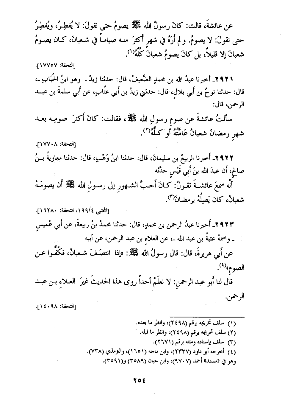 2921 - أَخْبَرَنَا عَبْدُ اللهِ بْنُ مُحَمَّدٍ الضَّعِيفُ، قَالَ: حَدَّثَنَا زَيْدٌ وَهُوَ ابْنُ الْحُبَابِ، قَالَ: حَدَّثَنا نُوحُ بْنُ أَبِي بِلَالٍ، قَالَ: حَدَّثَنِي زَيْدُ بْنُ أَبِي عَتَّابٍ، عَنْ أَبِي سَلَمَةَ بْنِ عَبْدِ الرَّحْمَنِ، قَالَ: سَأَلْتُ عَائِشَةَ عَنْ صَوْمِ رَسُولِ اللهِ صَلَّى اللهُ عَلَيْهِ وَسَلَّمَ فَقَالَتْ: «§كَانَ أَكْثَرُ صَوْمِهِ بَعْدَ شَهْرِ رَمَضَانَ شَعْبَانَ عَامَّتَهُ أَوْ كُلَّهُ»