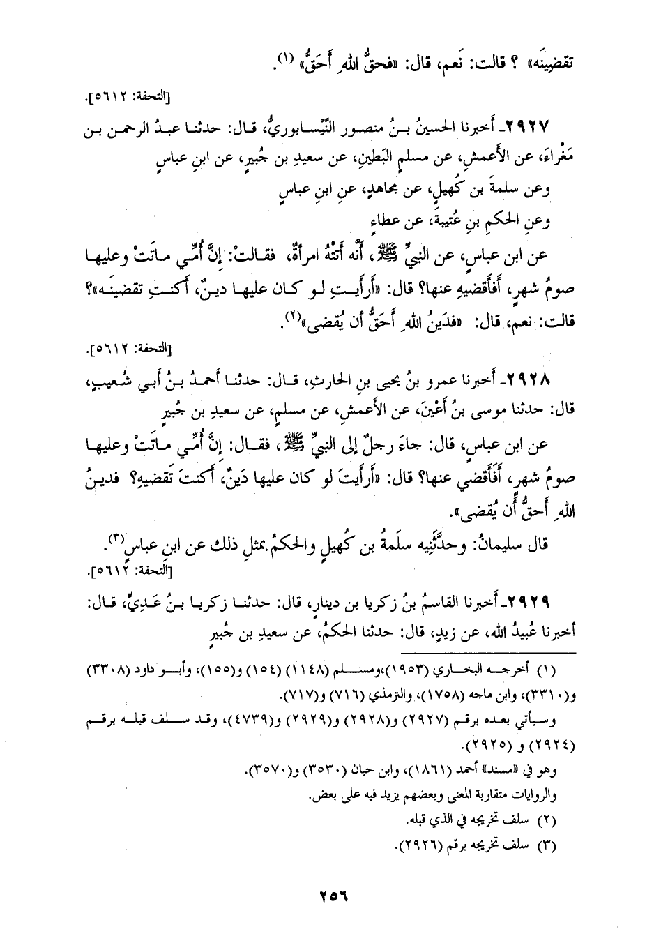 2927 - أَخْبَرَنَا الْحُسَيْنُ بْنُ مَنْصُورٍ النَّيْسَابُورِيُّ، قَالَ: حَدَّثَنَا عَبْدُ الرَّحْمَنِ بْنُ مَغْرَاءَ، عَنِ الْأَعْمَشِ، عَنْ مُسْلِمٍ الْبَطِينِ، عَنْ سَعِيدِ بْنِ جُبَيْرٍ، عَنِ ابْنِ عَبَّاسٍ، وَعَنْ سَلَمَةَ بْنِ كُهَيْلٍ، عَنْ مُجَاهِدٍ، عَنِ ابْنِ عَبَّاسٍ، وَعَنِ الْحَكَمِ بْنِ عُتَيْبَةَ، عَنْ عَطَاءٍ، عَنِ ابْنِ عَبَّاسٍ، عَنِ النَّبِيِّ صَلَّى اللهُ عَلَيْهِ وَسَلَّمَ أَنَّهُ أَتَتْهُ امْرَأَةٌ فَقَالَتْ: إِنَّ أُمِّي مَاتَتْ وَعَلَيْهَا صَوْمُ شَهْرٍ أَفَأَقْضِيهِ عَنْهَا؟ قَالَ: «أَرَأَيْتِ لَوْ كَانَ عَلَيْهَا دَيْنٌ أَكُنْتِ تَقْضِينَهُ؟» قَالَتْ: نَعَمْ، قَالَ: «§فَدَيْنُ اللهِ أَحَقُّ أَنْ يُقْضَى»